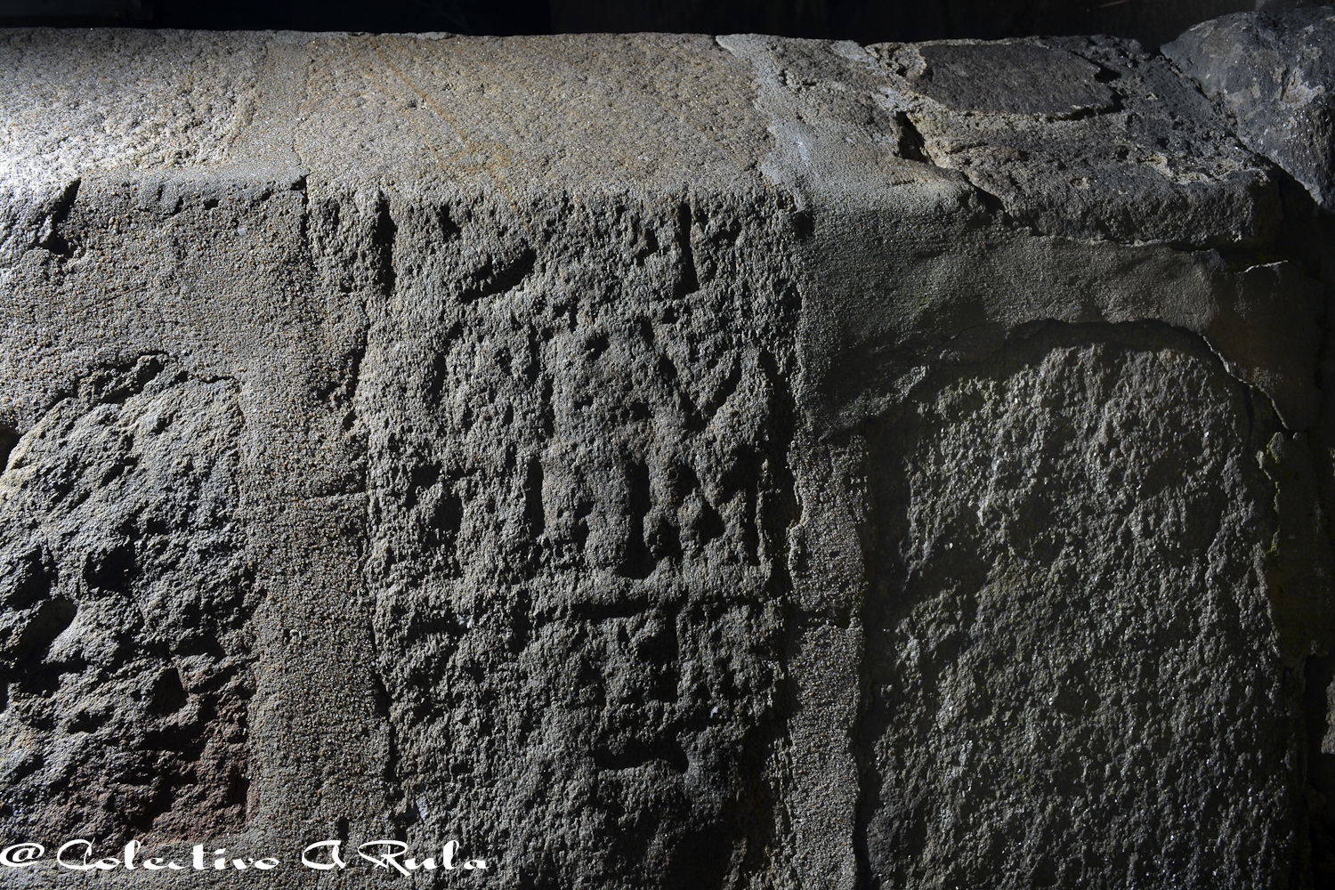 No esquinal leste da construción atópase unha pedra rectangular que conserva varios signos alfabetiformes moi erosionados. Trátase dunha pedra de cantaría bastante regular que posúe no seu extremo leste catro liñas de alfabetiformes. Na primeira liña apenas se conservan os trazos inferiores dalgunha letra ó coincidir co remate da parede. A segunda e a terceira liña son as mellor conservadas mais a súa lectura non é sinxela. A cuarta liña é, sen dúbida, a máis ilexible. Non obstante, poderíamos con moita prudencia propor a seguinte transcrición do conxunto: