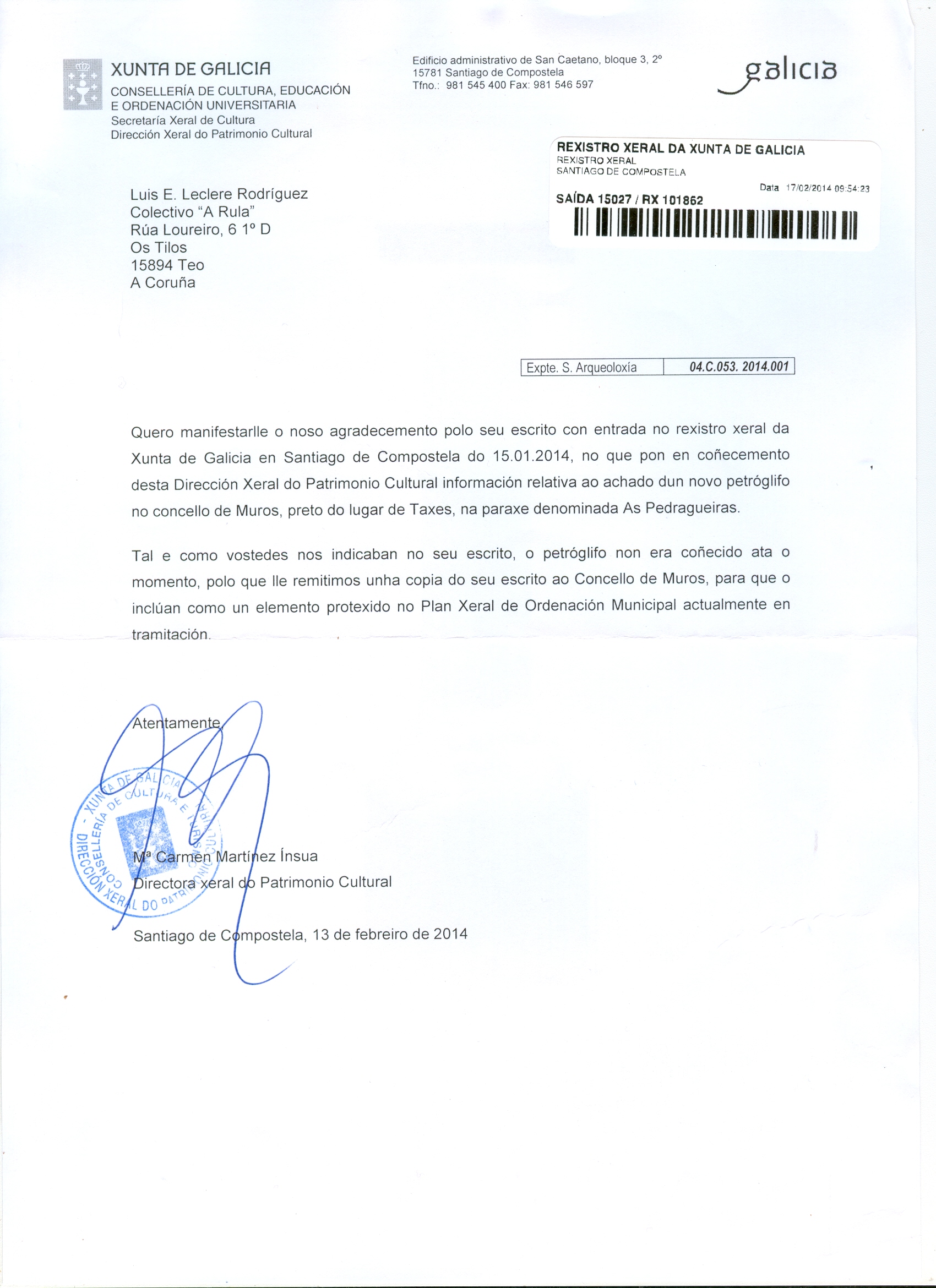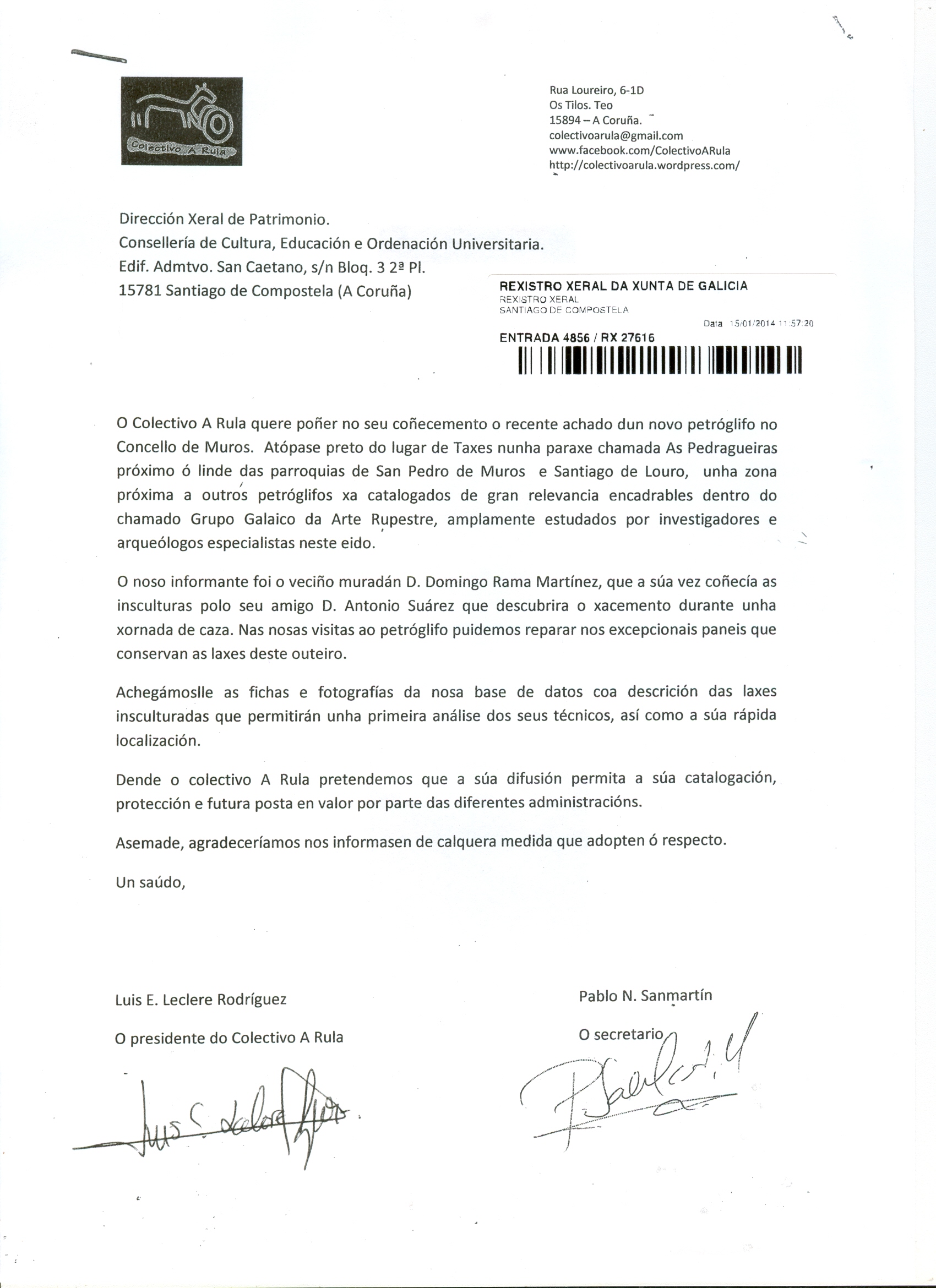 Foi tamén a nosa primeira comunicación realizada tanto á Dirección Xeral de Patrimonio da Xunta de Galicia como ó Concello de Muros informando deste novo Ben de Interese Cultural e solicitando a súa catalogación.