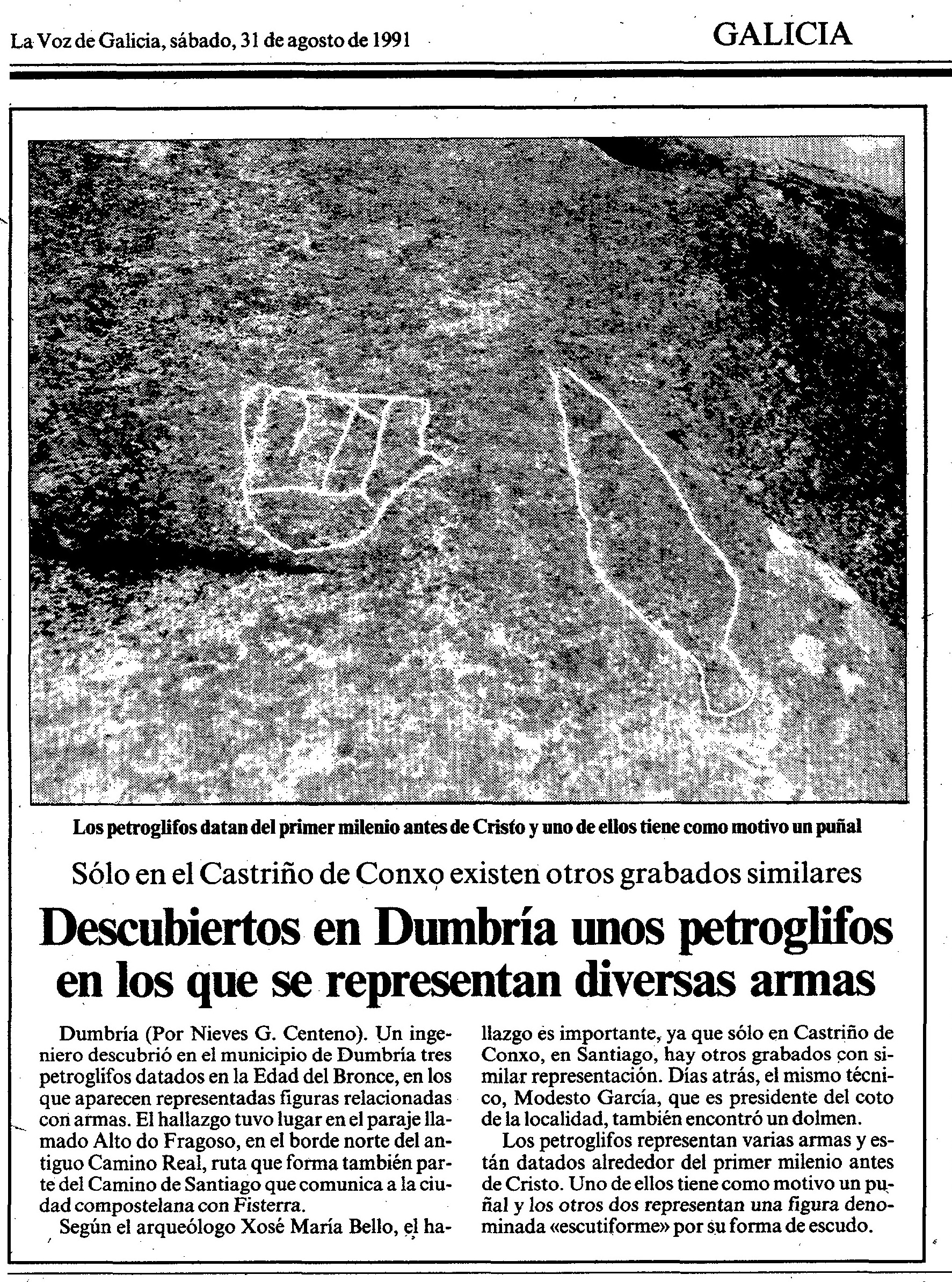 - Costas Goberna, J.F., Novoa Alvarez, Pablo e Albo Morán, José Mª (1993). “Los grabados rupestres de armas de Pedra Ancha (Dumbria, A Coruña”, En: Brigantium. Bol. Museo Arqu. Hist. Coruña.Vol. 8. pp. 245-262