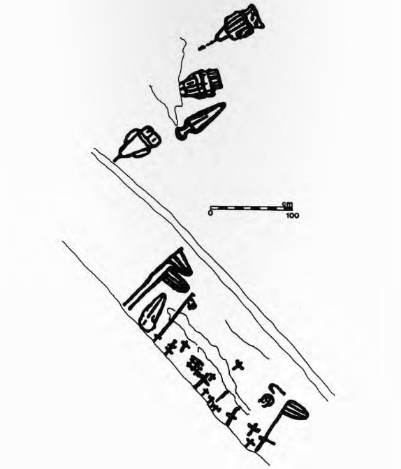 As alabardas representadas, todas orientadas na mesma dirección á dereita, son similares ós modelos Carrapatas da Idade do Bronce localizadas nos rexistros arqueolóxicos do NO peninsular.