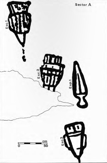 Na parte central da cara oriental é onde figuran estes 3 escutiformes dispostos case en liña. As súas dimensións oscilan entre os 60 e 70 cm de longo por 40 de ancho. Ó carón dun deles atópase tamén un puñal ou espada curta de tipo espigo (sen cravos de suxeición) con empuñadura e coa posible representación do nervio central moi erosionado