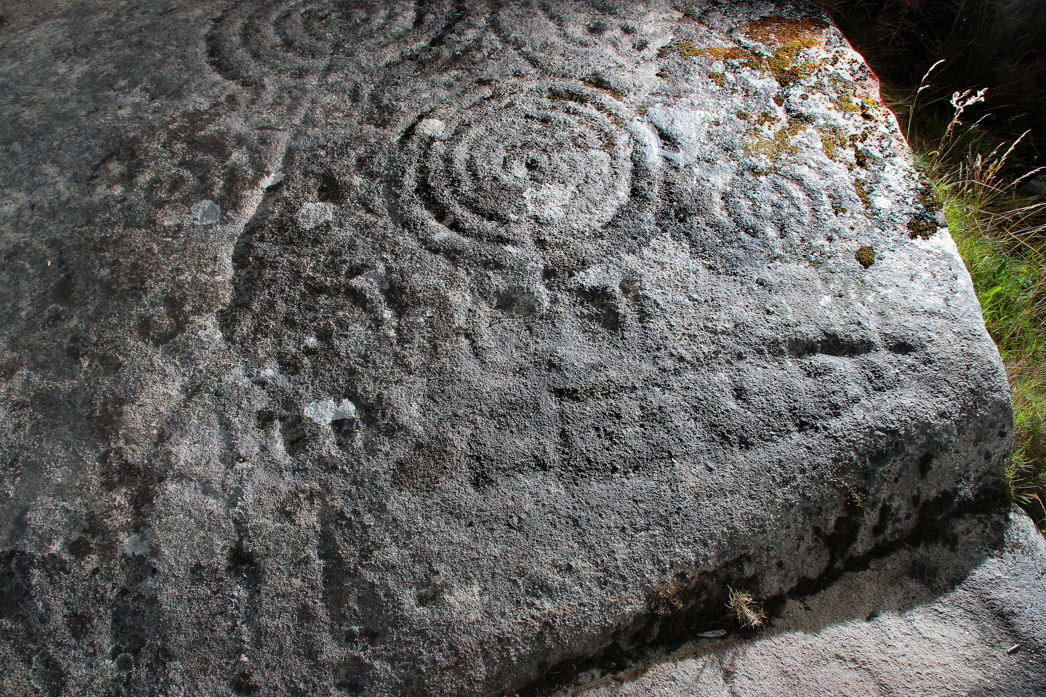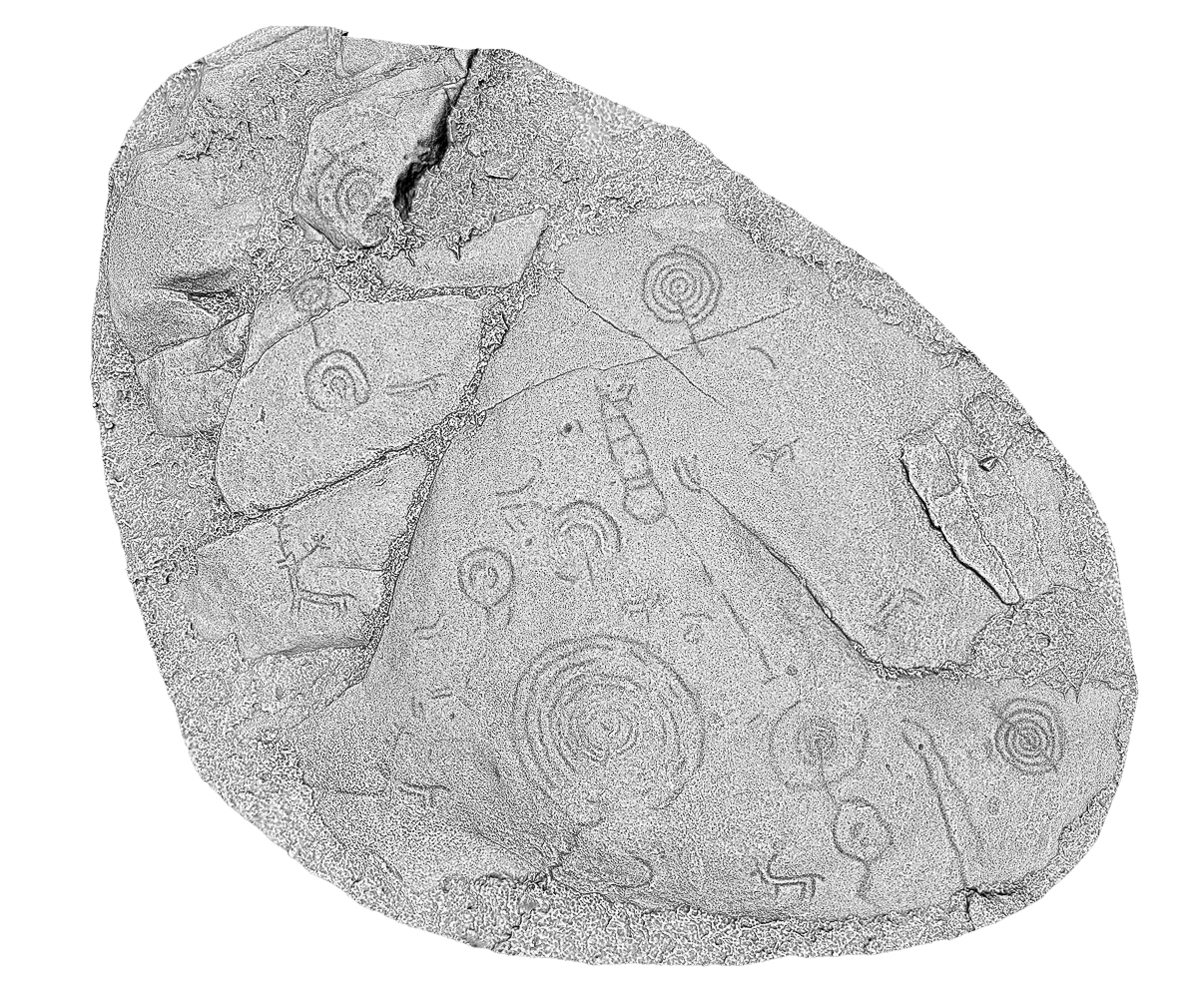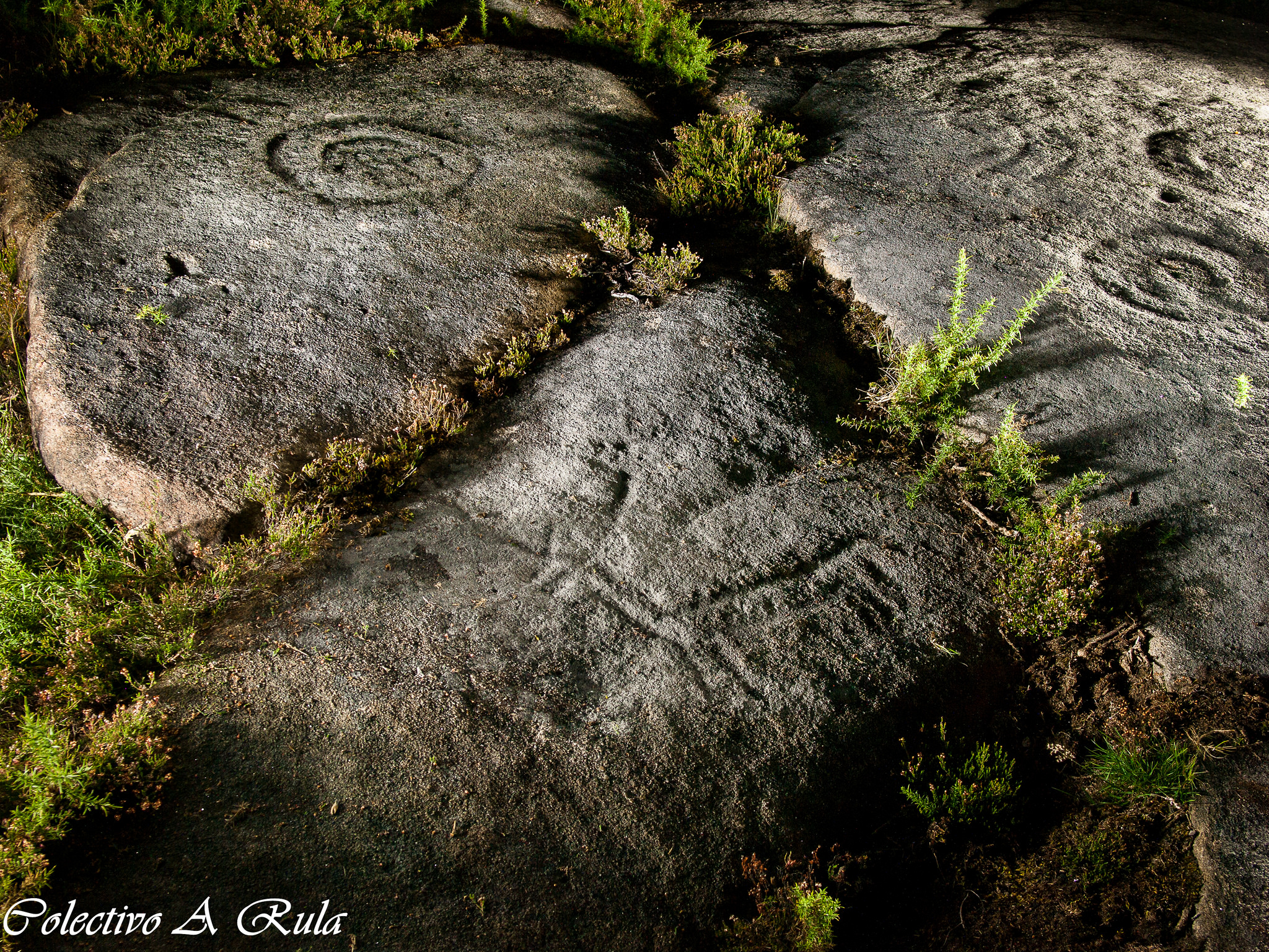 Nun amplo panel, que presenta unha forte inclinación cara o SE, hai representados un mínimo de  10 combinacións circulares moi próximas entre si (dúas delas posiblemente sexan espirais). Os seus diámetros oscilan entre os 23 cm e 110 cm, presentado a maioría unha coviña central. O estado de conservación é moi desigual sendo facilmente visibles a gran combinación que preside o panel (probablemente a de maior tamaño da comarca) e as situadas á súa dereita.