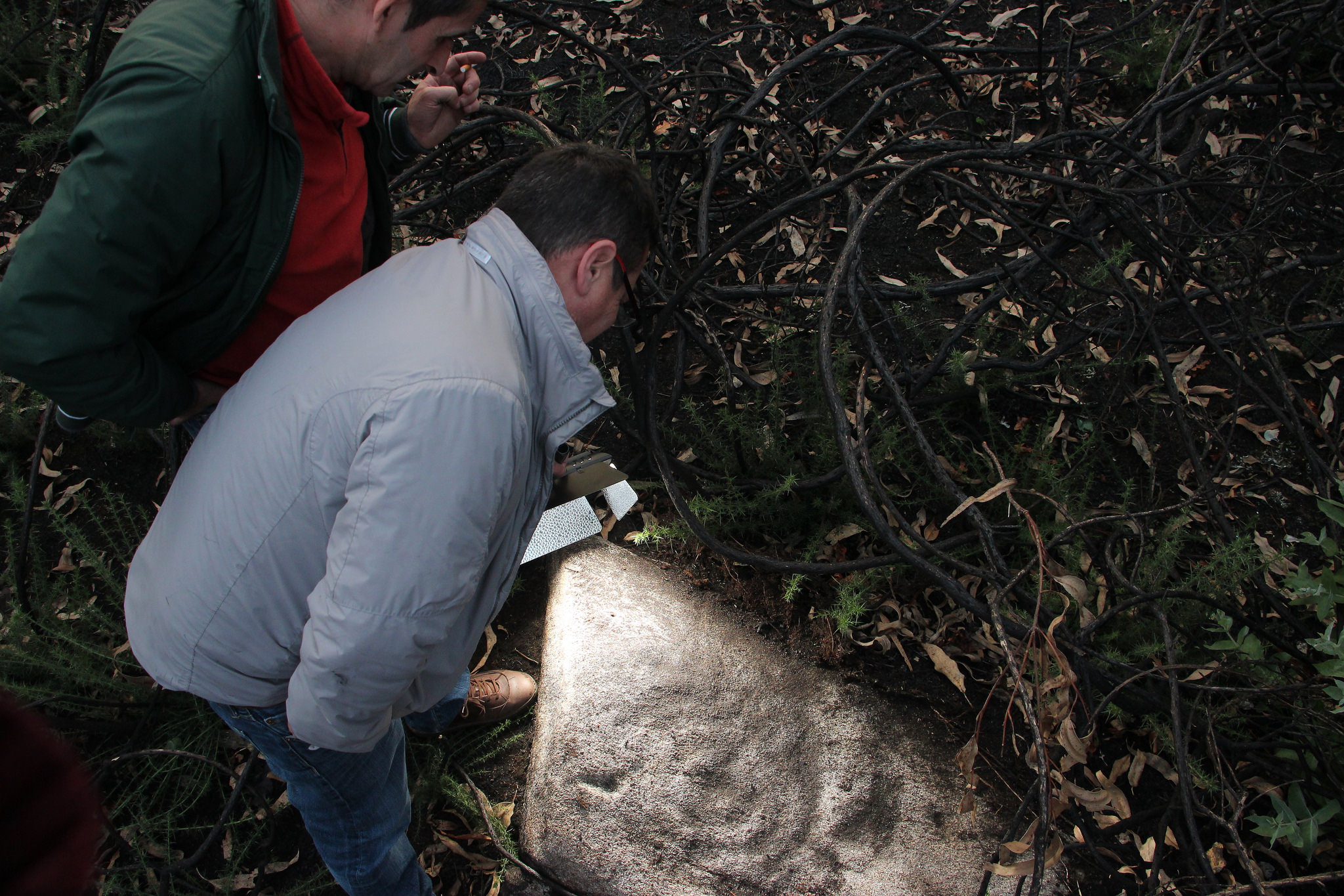 Hai só uns días nun dos paseos rutineiros pola zona descubrimos un novo petróglifo na parte baixa do Monte de San Miguel, ó carón mesmo do Camiño de Santiago. A propia pista por onde transcorre a senda xacobea a Fisterra serviu de freo ó avance das lapas neste extremo Sur da área afectada polo lume.