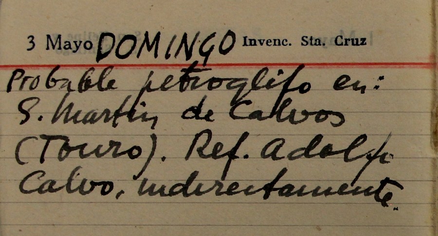 Concretamente na súa axenda do ano 1953 consta un apuntamento sobre o “Petróglifo de Calvos” achegado por un dos seus mellores colaboradores e amigo, Adolfo Calvo, o coñecido practicante municipal do Concello de Teo e descubridor doutros petróglifos na comarca compostelá. Unha mostra máis da relevancia deste fondo documental, no que seguimos a traballar, convencidos da súa gran utilidade para abrir novas liñas de investigación que faciliten a recuperación de petróglifos hoxe en día esquecidos ou perdidos.