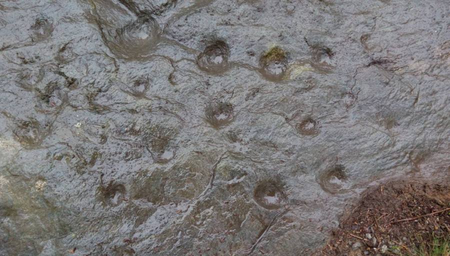 Así, cómpre subliñar esta aliñación de varias coviñas e cazoletas unidas por un suco duns 2 cm de largo e case 1 metro de longo que describe unha liña curva que discorre pola zona central do panel, cruzándose con outro suco que une dúas das coviñas de maior tamaño.