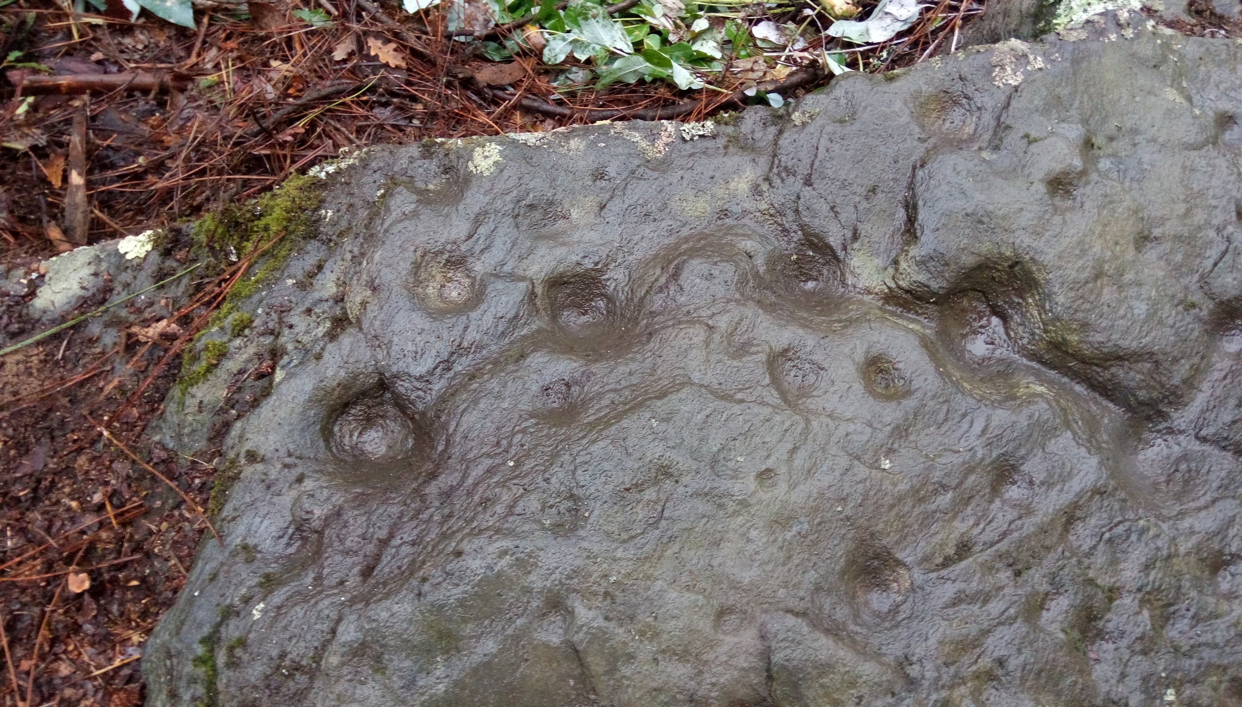 Así, cómpre subliñar esta aliñación de varias coviñas e cazoletas unidas por un suco duns 2 cm de largo e case 1 metro de longo que describe unha liña curva que discorre pola zona central do panel, cruzándose con outro suco que une dúas das coviñas de maior tamaño.