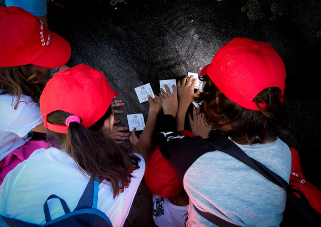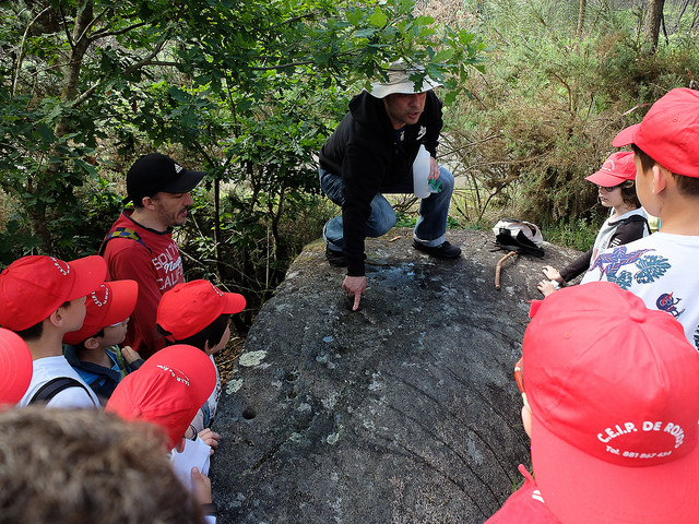 O primeiro que fixemos foi marcar o primeiro petróglifo que debian atopar nos seus mapas. Tamén decidimos depositar previamente ‘pequenas ofrendas’ nas coviñas principais dos paneis (unhas diminutas gomas de borrar de cores e formas diversas). Algún neno despois preguntounos se algún de nos ‘deixaramos antes eses regalos’ alí nas coviñas. Non sendo capaz de romper esa ilusión primixenia e chea de todas as forzas da vida e do mundo… dixenlle que ‘eu non sabía’.