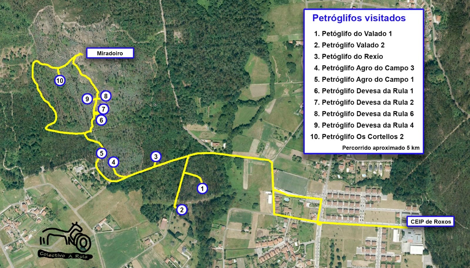 Esta excursión iniciámola ás portas do val, moi preto da escola de Roxos, que ten o privilexio de estar situada mirando cara montañas cheas de gravados rupestres que delimitan o val de Villestro. Importante era poñer en contexto a situación dentro do territorio, do país e do planeta.