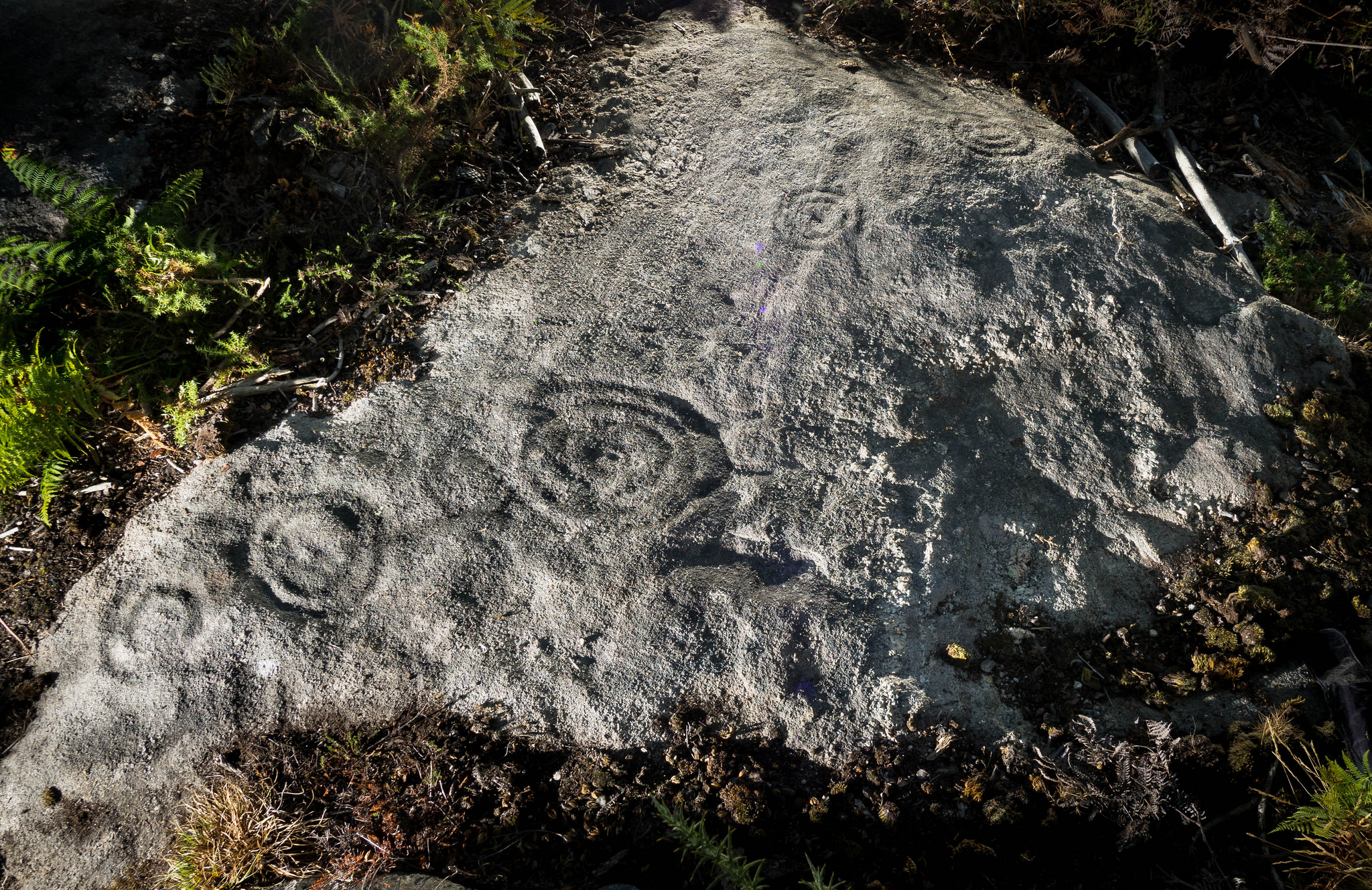 Na parte máis plana e elevada desta gran peneda salienta a presenza dunha combinación circular de 3 aneis e coviña central de 39 cm de diámetro.