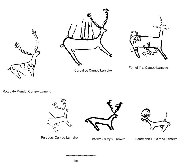 Como sinalamos o deseño estilístico do cervo remítenos ós petróglifos da bacía do Lérez e, como referimos anteriormente, principalmente os petróglifos dos Concellos de Cerdedo – Cotobade, Campo Lameiro e Moraña. Imos citar a modo de exemplo algúns deles.