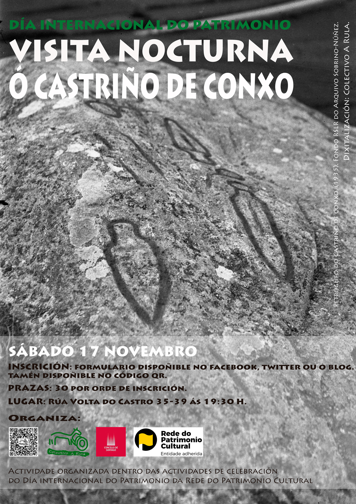 O vindeiro sábado 17 de novembro con motivo da celebración do Día internacional do Patrimonio e dentro da iniciativa conxunta dos membros da Rede do Patrimonio Cultural, o Colectivo A Rula xunto co Concello de Santiago de Compostela, a través da súa Concellaría de Espazos Cidadáns, Dereito á Vivenda, Mobilidade e Relacións Veciñais, convidámosvos a realizar unha visita nocturna para coñecer o Petróglifo do Castriño de Conxo.
