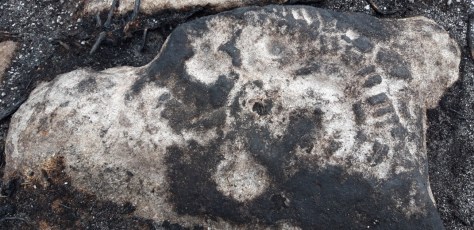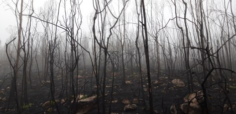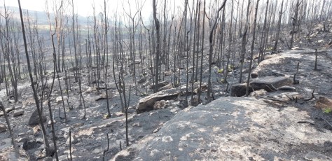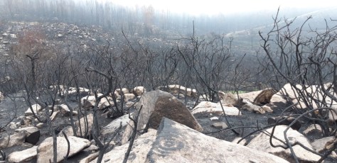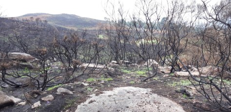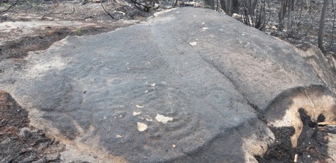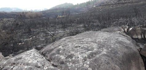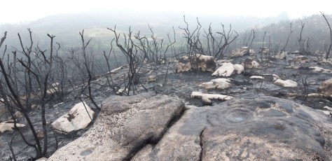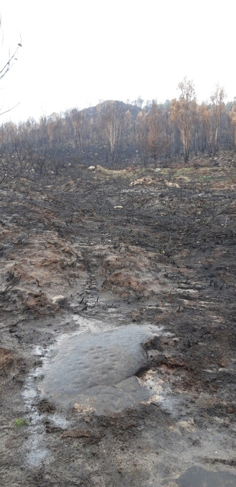 A case totalidade do monte onde se sitúan os petróglifos de Gargamala está cuberto de cinzas e de lama negras, xunto con miles de esqueletos de árbores queimadas.