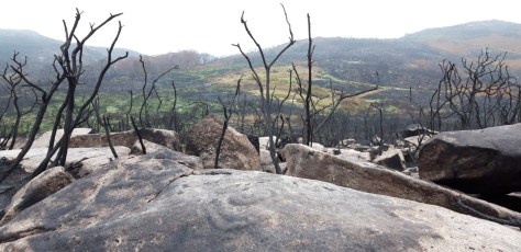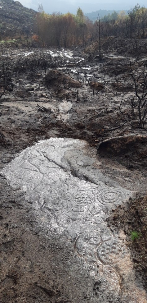 É ben sabido que os lumes que tanto tempo levan asolando o territorio galego e portugués nos últimos anos, e que se van volvendo cada vez máis brutais e mortíferos debido as alteracións climáticas, teñen efectos devastadores non soamente para a flora e fauna senón tamén para todo o que o lume se atopa diante, no noso caso, os petróglifos.