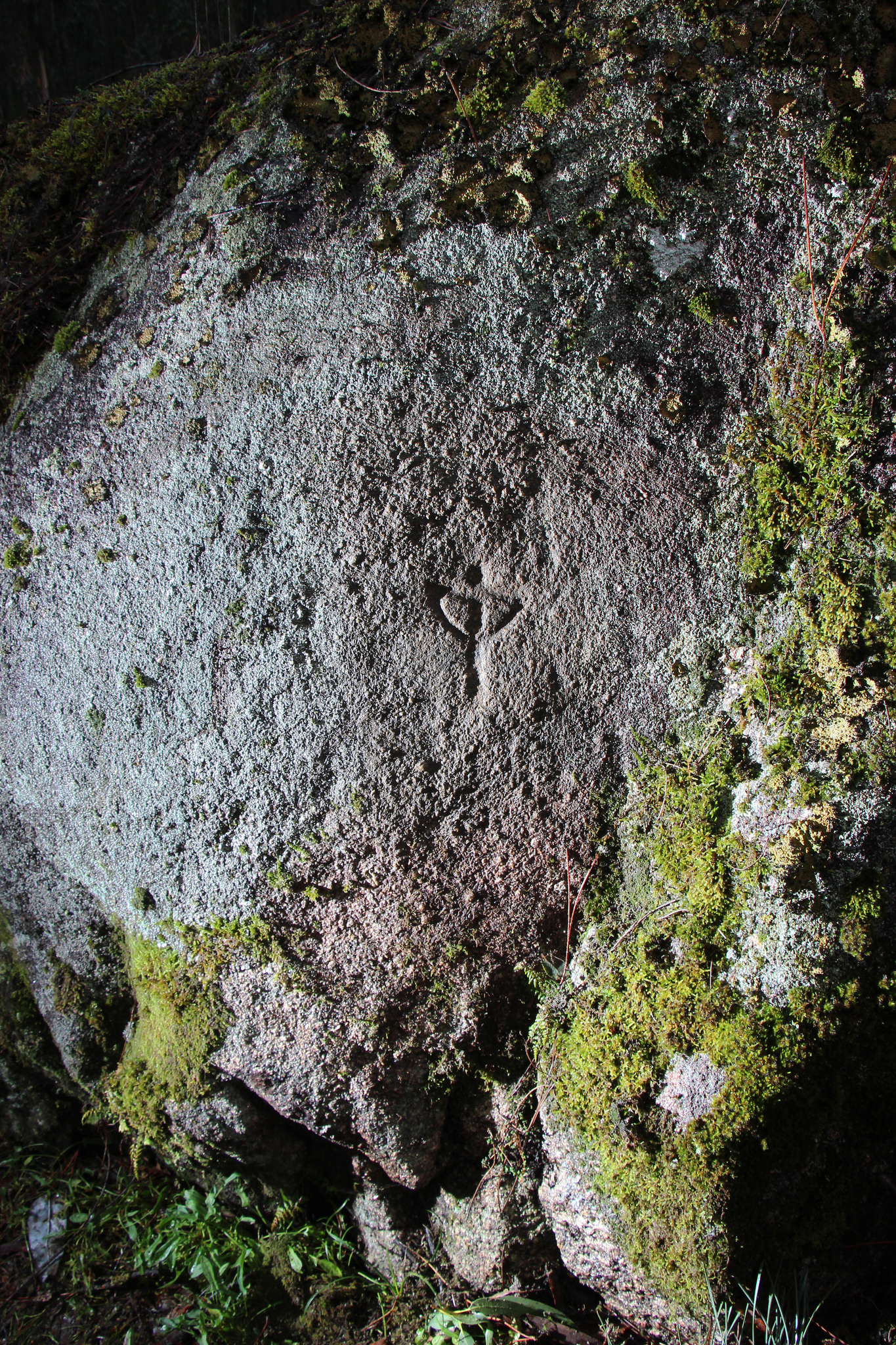 No lateral do penedo, na superficie máis vertical e regular, consérvase unha cruz con forma de bésta, elaborada con instrumentos metálicos atendendo ó perfil en V do seu estreito suco.