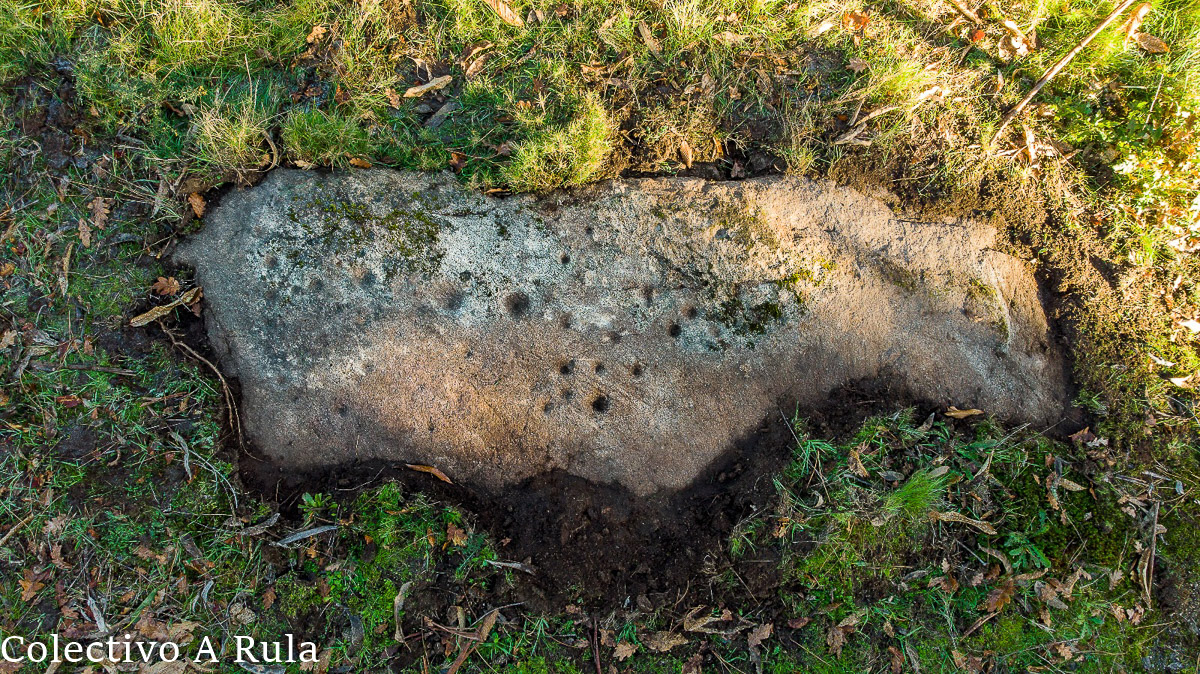 Pois porque, como xa contamos noutra ocasión, na excursión que realizaron aló polo ano 1909 Henrique Campo Sobrino e Henrique Mayer guiados por Óscar Lojo Batalla o excelente debuxante da Sociedade Arqueolóxica de Pontevedra debuxou dúas laxes con gravados, a redescuberta no ano 2015 e unha segunda que segue a estar perdida a día de hoxe. Esta laxe desaparecida, á imaxe da descrita neste post, estaría composta só por coviñas.