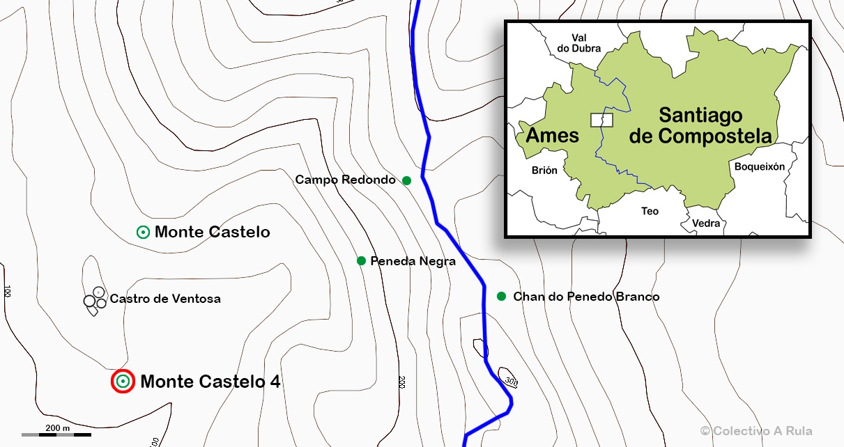 Sitúase no lugar de Castelo, na aba do monte onde se conserva o castro de Monte Castelo, na ladeira sur que descende cara o leste, ó encontro do Rego Luceiro, e a escasos 200 metros da croa do xacemento.