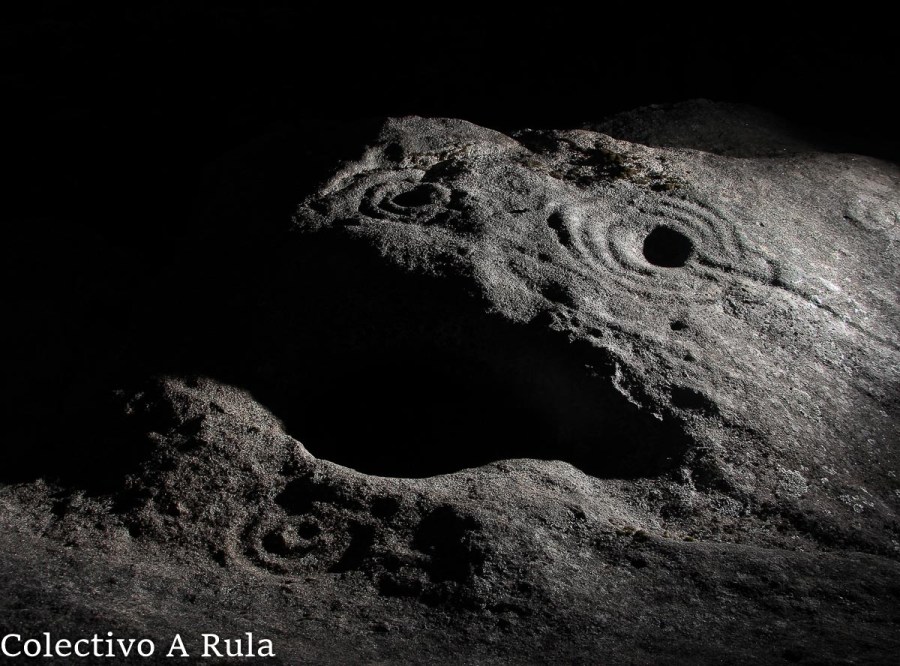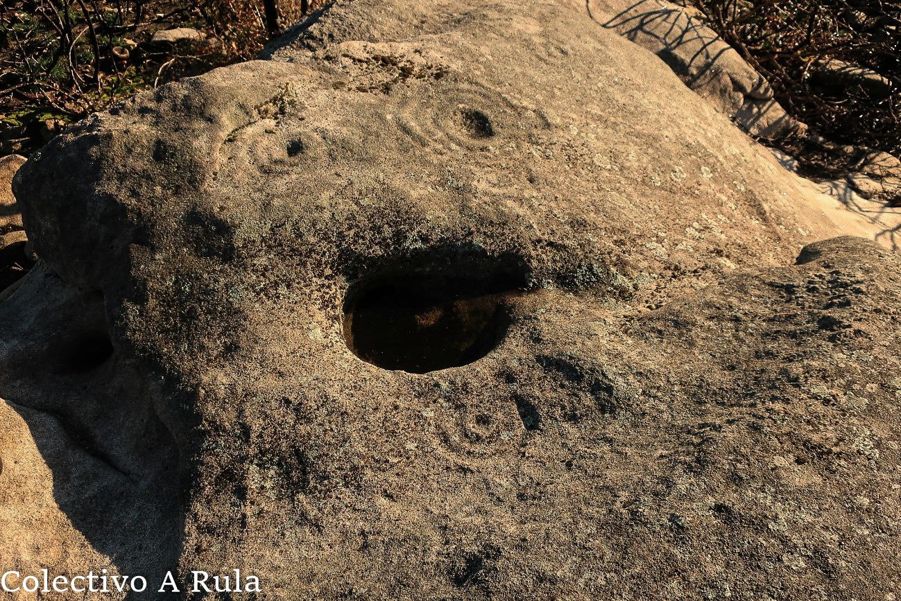 Finalmente na parte máis inclinada da laxe orientada ó SO localizamos dúas novas combinacións circulares adaptadas á propia morfoloxía da laxe que forman dous “petóns”.