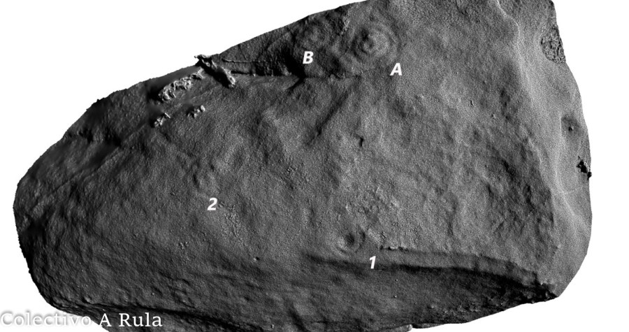 A primeira (A) posúe de 25 cm. de diámetro con 3 aneis e coviña central e o seu carón unha segunda (B) máis erosionada con dobre anel (21 cm.).