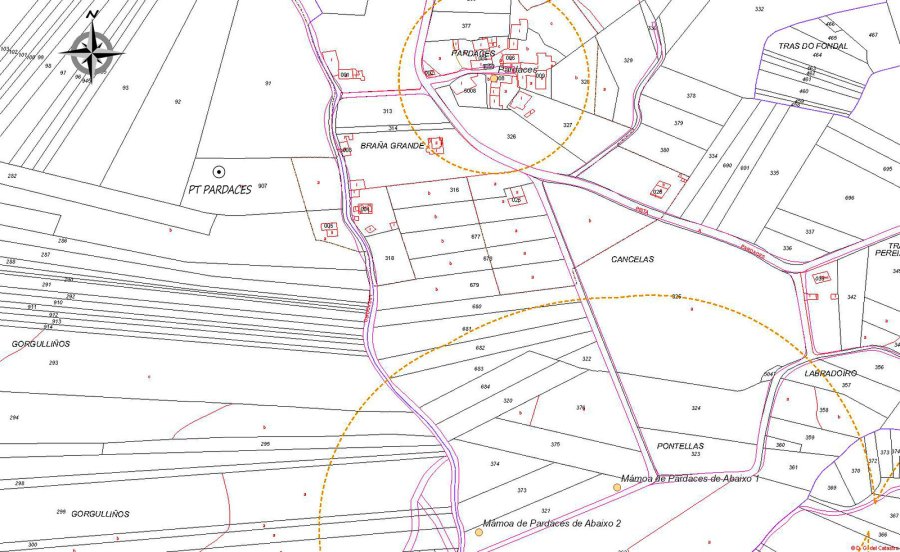Un dos aspectos que comparten os xacementos de Casa do Frade, Os Gorgulliños e Fonte Matanza é o de estar situados nas proximidades de fontes, mananciais ou recollidas de augas. Os penedos gravados de Casa do Frade dominan a bacía do rego de Fontecova. No de Pardaces de Abaixo o microtopónimo inmediato ao sur da peneda é o de Gorgulliños. No de Fonte Matanza recóllese na súa denominación o microtopónimo do manancial de augas situado ao seu carón.