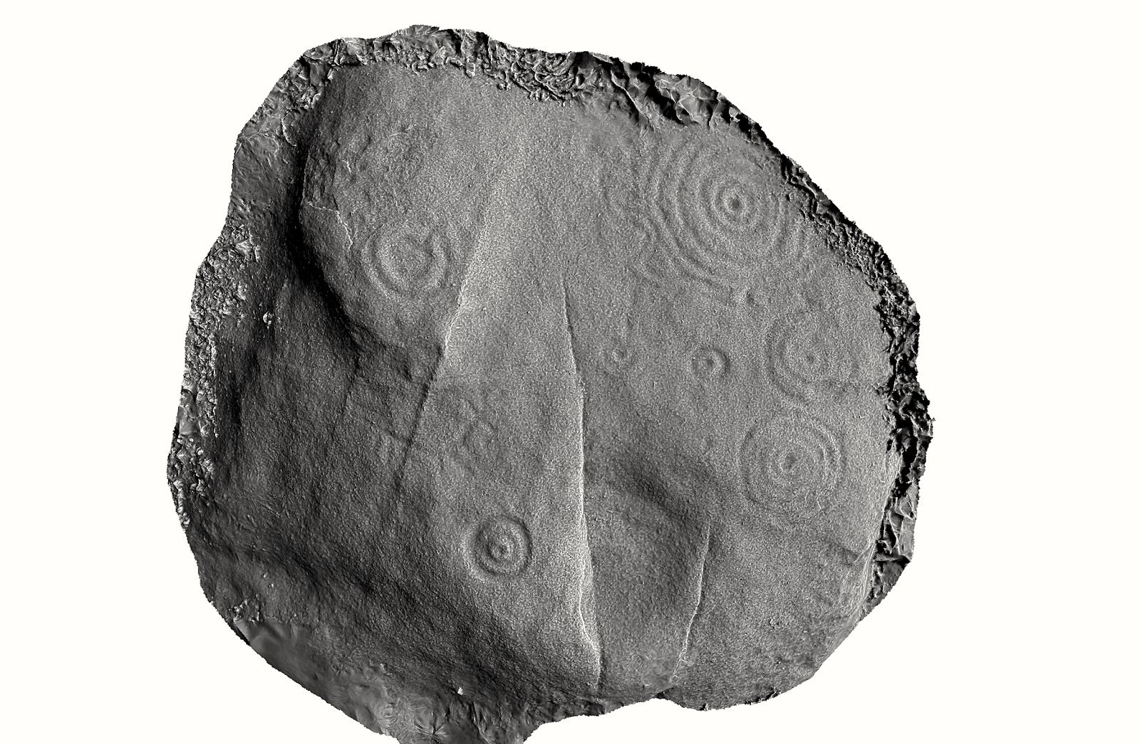 Xiabre 2. Reconstrución fotogramétrica do petróglifo do Monte Xiabre 2 onde se aprecian novos motivos non rexistrados como un cuadrúpede e un serpentiforme. Alex Negreira, 2018.