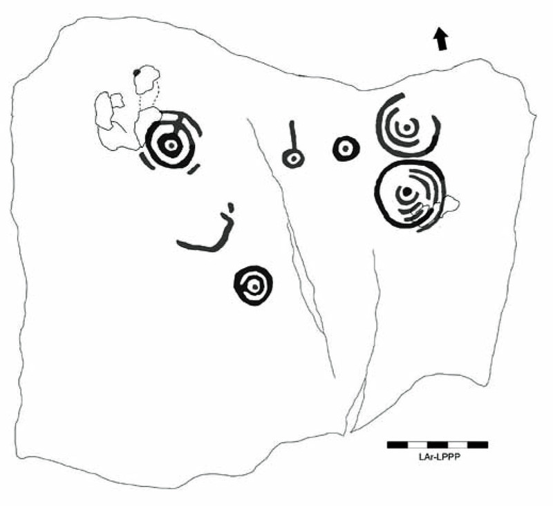 Tampouco consideramos que o emprego deste tipo iconográfico teña relación co emprazamento destas estacións na paisaxe ou de determinadas formas de asentamento do territorio destas comunidades pois estes motivos figuran en laxes de diferentes formas, pequenas e grandes, tanto en paneis verticais como horizontais, en laxes situadas na cima de outeiros como a media ladeira con amplos horizontes de visualización.