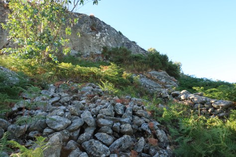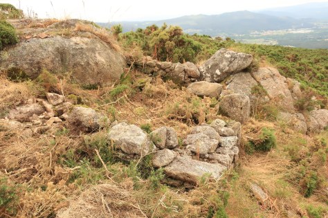 Flanqueando a zona do grande afloramento central atopamos un grande anel pétreo de derrubo do que semella foi unha muralla ou bastión, apoiada e acaroada ás diferentes penedas, algunhas con marcas de rebaixes, furados circulares e acanaladuras que deberon servir de suxeición e alicerces de diferentes estruturas, posiblemente de madeira. Son fragmentos de murallas de pedras pequenas sen labrar seguindo a técnica tradicional de construción coa pedra en seco. O ancho deste material de derrubo chega nalgunhas zonas ós 4 metros e esténdese formando un arco dende o lado N ó SE que bordea ó grande rochedo central.