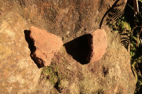 Entre os materiais localizados en superficie destaca a presenza de cuantiosos restos de tella. Foron localizados en diferentes zonas do recinto, máis son numerosos os fragmentos achados no interior e na entrada dunha pequena cova emprazada na zona oeste do afloramento, cunha entrada duns 2,15 metros de altura por 1,50 de ancho e apenas 3 metros continuidade cara o interior pois está tapada por numerosos bloques de pedra desprendidos. Os restos de tella, tanto plana como curva, son grosos, de ton alaranxado e con abundante desgrasante que denotan a súa antigüidade.