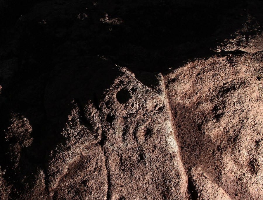 Pegada á fenda, na parte sur do panel, hai tamén un segundo “petón” con unha combinación circular moi erosionada de dobre anel e adaptada á morfoloxía da rocha, ten uns 15 de diámetro (4), a carón apreciase outro anel con coviña central tamén moi degradado (5).