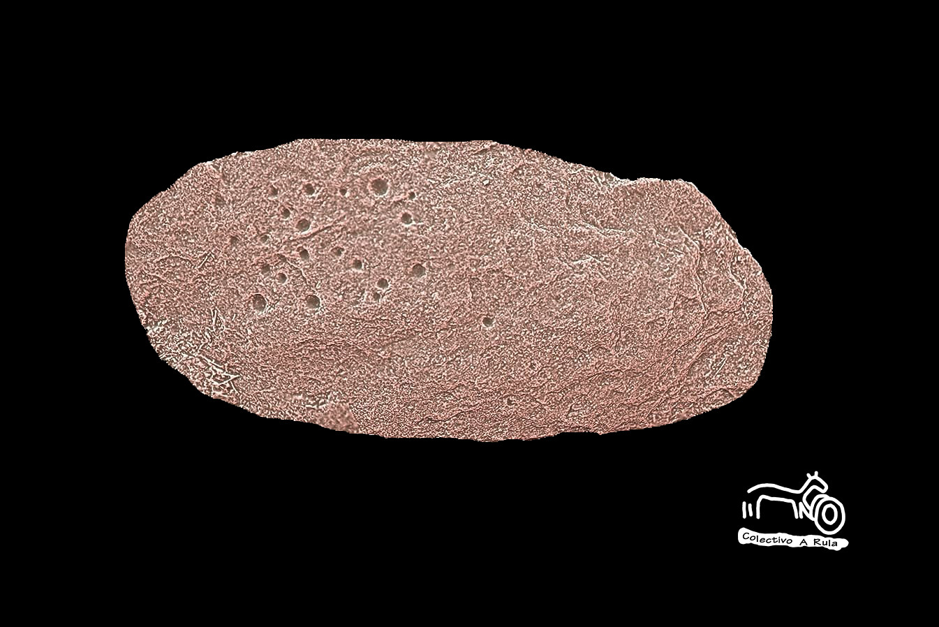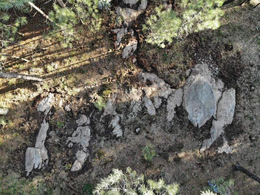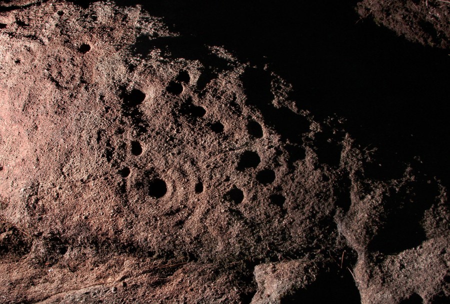 De feito, moitas delas presentan marcas de extracción e pegadas desta actividade. Nunha das laxes aínda se aprecia unha forma circular duns 58 cm de diámetro, posiblemente traballada para unha capa ou tornarratos dun hórreo, que por algunha razón non se chegou a extraer. Curiosamente noutras rochas quedaron as pegadas da extracción de elementos semellantes que si foron rematados. Todas elas son de diámetros similares, polo que pensamos que foron arrincadas nun mesmo momento e empregadas para a mesma finalidade.