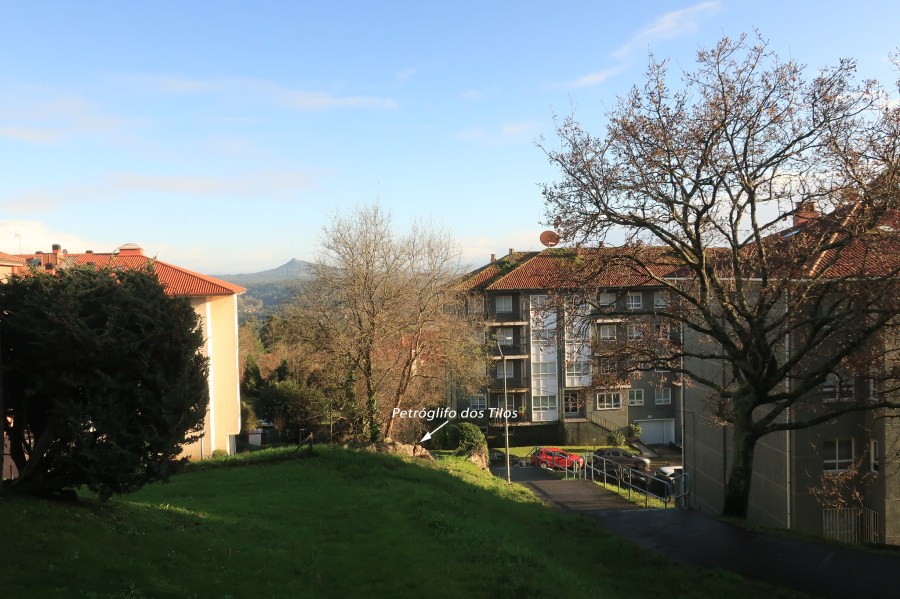 Este petróglifo atópase detrás do pavillón da urbanización Os Tilos, nun afloramento de xisto situada na parte sur-leste dunha parcela dedicada a prado que linda coa coñecida Casa da “Leira da Viña” da aldea de Cobas. Coordenadas N 42 50.464, W 8 32.285 (Datum WGS85), altitude 209 m.s.n.m.