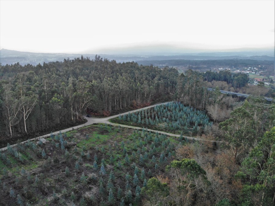 Neste exemplo resérvase un 55% da superficie do espazo para a produción de madeira, con castiñeiros nas mellores zonas e unha mestura de pino do país e bidueiro nos sitios con condicións máis limitantes. As áreas de interese natural con mellores solos dedícanse á restauración ecolóxica de devesas con diferentes especies autóctonas (carballos, castiñeiros, pradairos, cerdeiras, etc.). Nas patrimoniais, polo xeral con solos que presentan limitacións, restrinxiríase a diversidade de especies ás máis tolerantes (como son os carballos e bidueiros). A súa vez o obxectivo de manter estes espazos abertos para a protección dos elementos arqueolóxicos aprovéitase para a plantación de árbores e arbustos produtores de froitos silvestres (como son espiños brancos, acivros e outros) a fin de favorecer a fauna silvestre.
