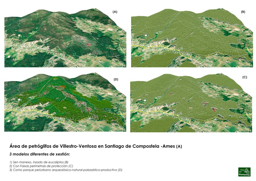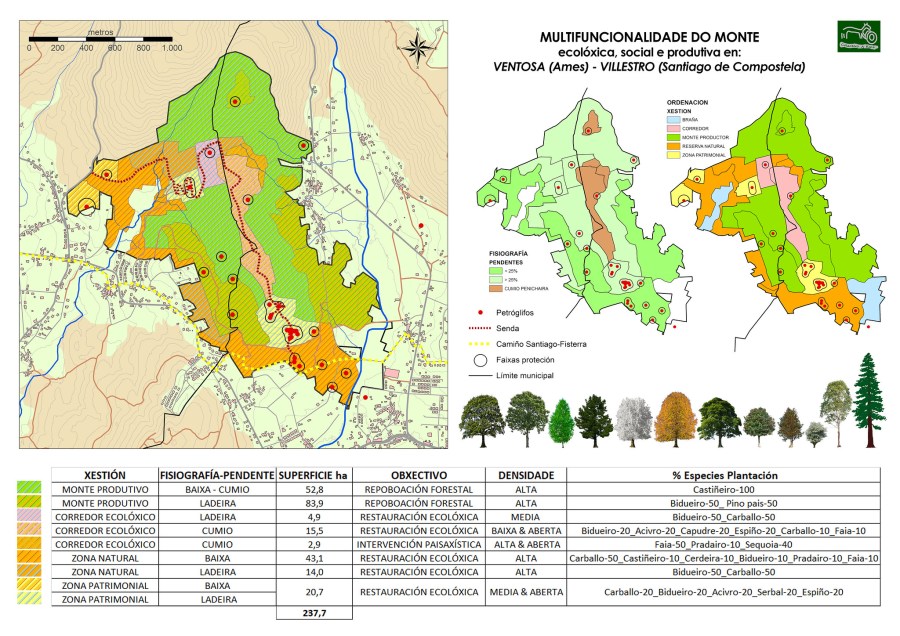 Queremos aportar en positivo e por iso compartimos finalmente un exemplo de ordenación multifuncional nun monte de carácter peri-rur-urbano de interese patrimonial na comarca de Compostela. O Monte de Villestro- Ventosa, no límite municipal entre Santiago e Ames, por onde pasa o camiño de Santiago a Fisterra, pletórico dunha das mellores mostras de arte rupestre galaica por estas terras. Este exemplo, que podería tamén ser aplicado noutros moitos lugares, é provisional. Precisaríanse estudos e planificacións máis pormenorizadas para a ordenación e planificación axeitada de espazos coma este, en función da existencia dos elementos arqueolóxicos, a conexión ecolóxica e a produtividade segundo a calidade dos solos e a cuberta vexetal existente.