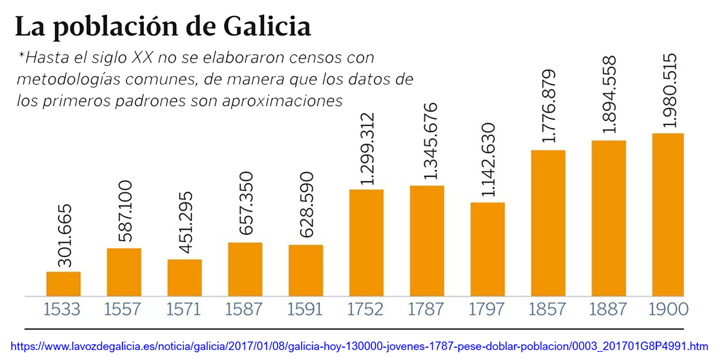 O crecemento demográfico, que en Galicia supuxo triplicar a poboación entre finais do século XVI e finais do XIX, sostívose pola expansión dos cultivos e a mellora da produtividade agraria, como consecuencia da adopción dos cultivos do millo e a pataca. Unha vez acadados os límites de capacidade de carga humana do ecosistema este boom demográfico desembocou nunha “crise malthusiana”, que aquí non chegou ao dramatismo da “Gran fame irlandesa” de mediados do século XIX, grazas á maior variedade do policultivo galego, cunha menor dependencia exclusiva na pataca. Porén, desencadeáronse vagas de fame e calamidades, denunciadas e retratadas na literatura por autores como Rosalía e Valle-Inclán.