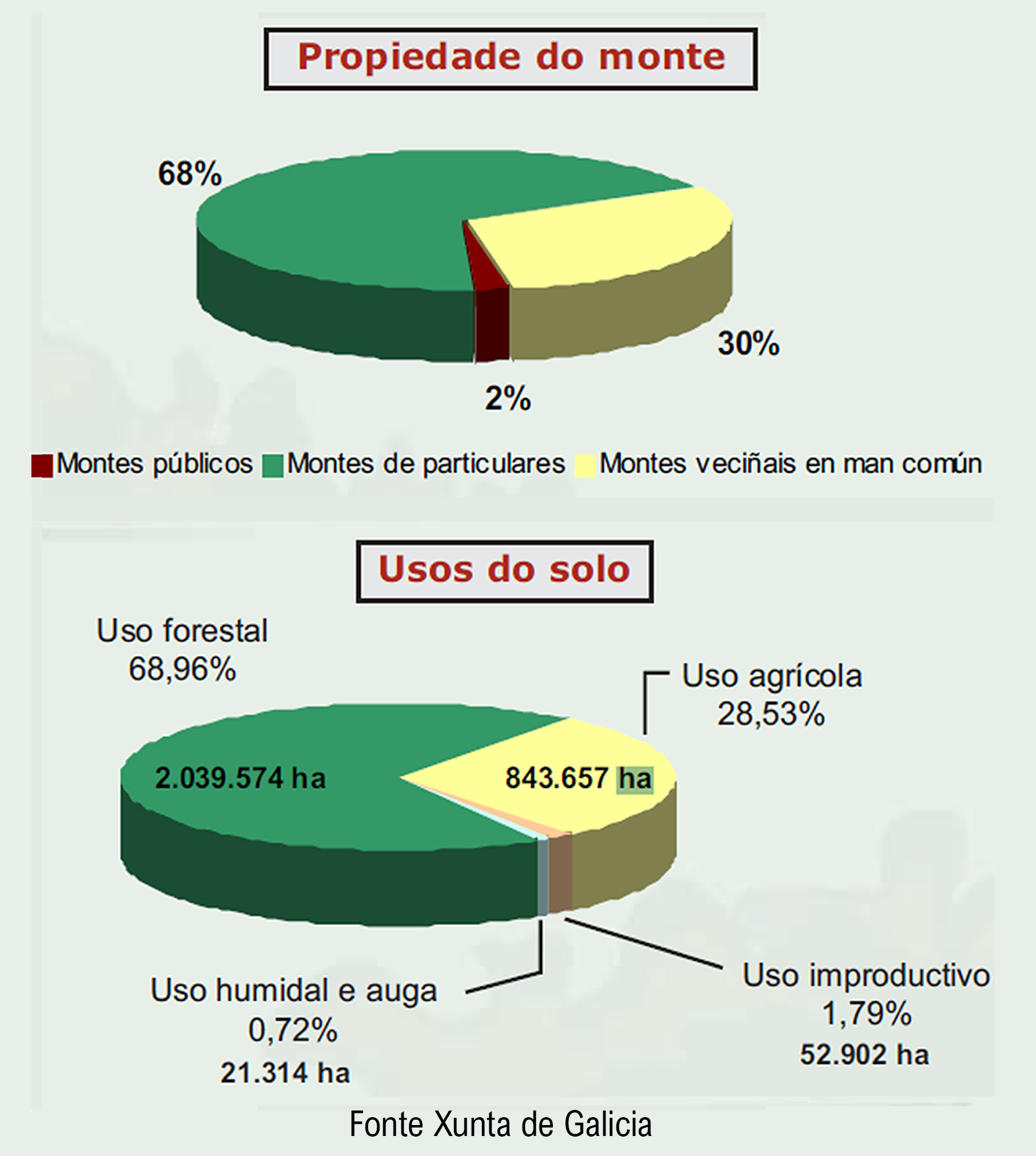Os datos dispoñibles informan que en Galicia o 68% da superficie dos montes pertence a aproximadamente dous terzos de millón de propietarios individuais, posuidores de entre dúas e unha hectárea e media repartidas en pequenas parcelas dun tamaño medio de 2.300 m2, superficie completamente insuficiente para unha explotación forestal racional (danse casos de parcelas menores a 2.000 m2 nos que o propietario chega a ter que pagar para que lle corten as árbores).