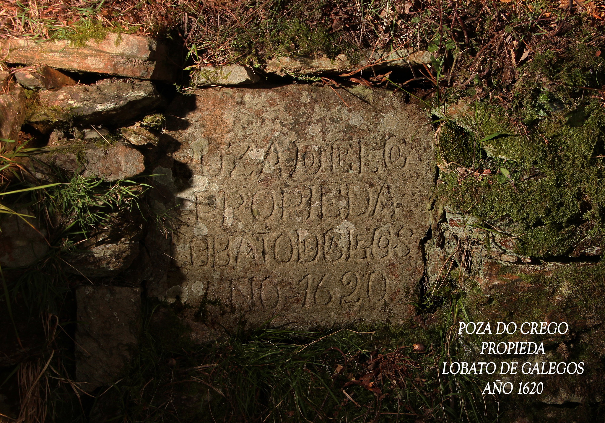 O feito diferencial desta construción é a presenza dunha inscrición epigráfica en galego que dá conta da data de construción e do seu propietario, e que podemos transcribir do seguinte xeito: “POZA DO CREGO / PROPIEDA / LOBATO DE GALEGOS / AÑO 1620”. Esta data concorda coas primeiras referencias documentais que tiñamos doutros corgos da zona, mais é o único destes bens que conserva unha datación in situ.