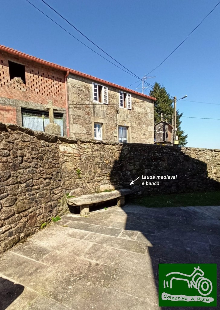 En fronte á entrada principal do templo chamounos a atención un improvisado banco feito polos/as fregueses/as. Voltearan a tampa dun antigo sartego medieval para acondicionar este asento de pedra que apoiaron sobre dous pés de pedra.