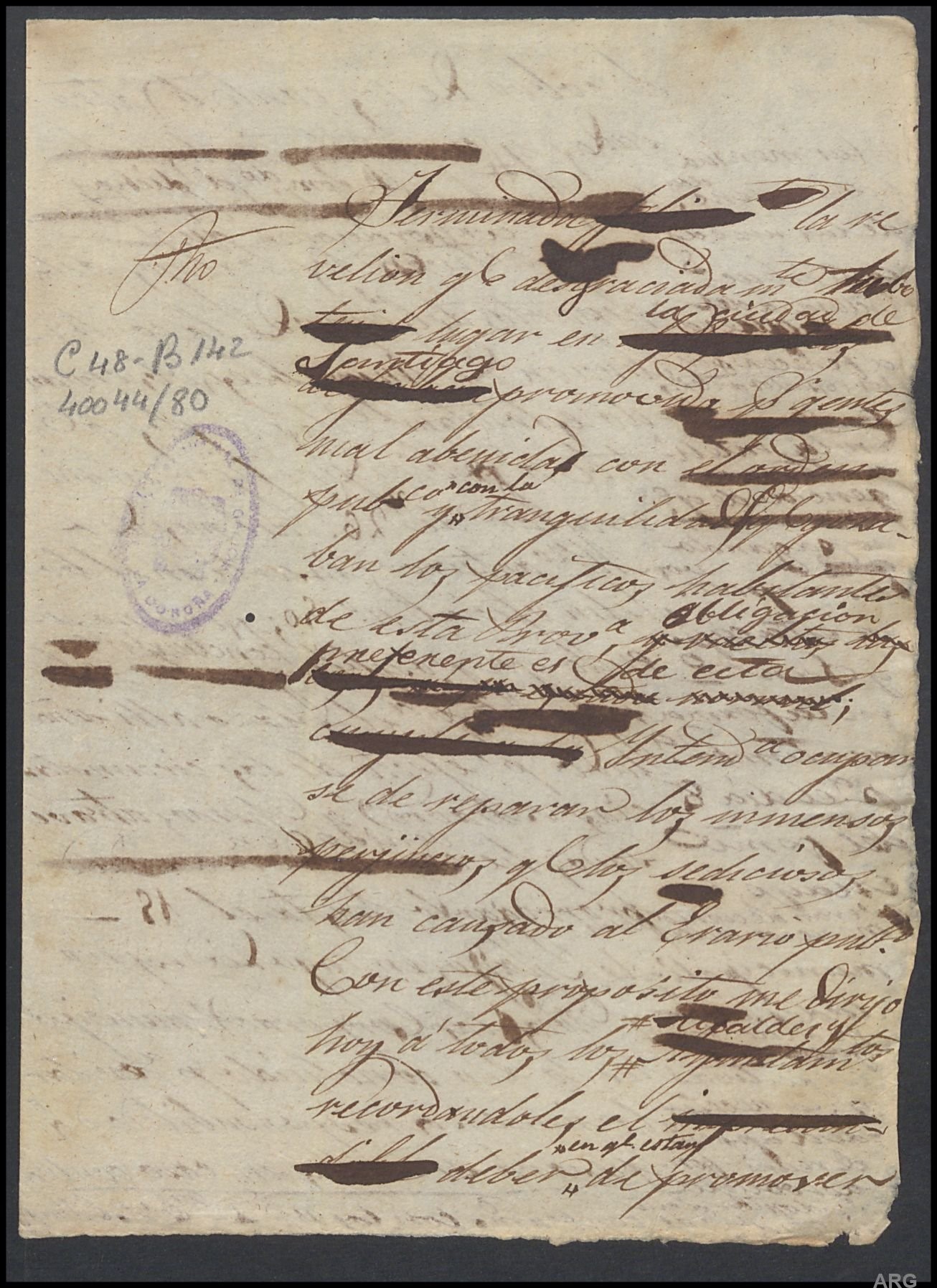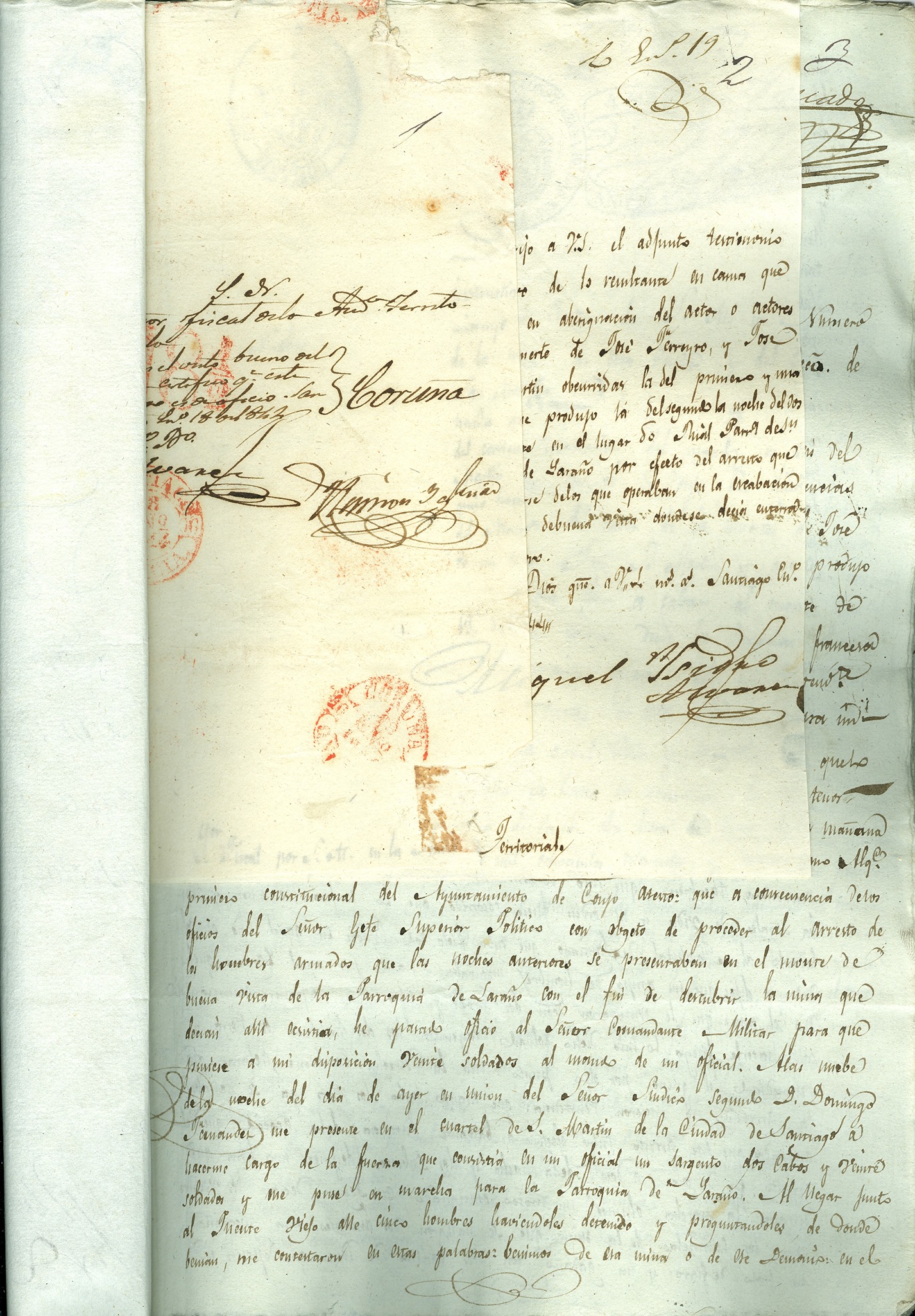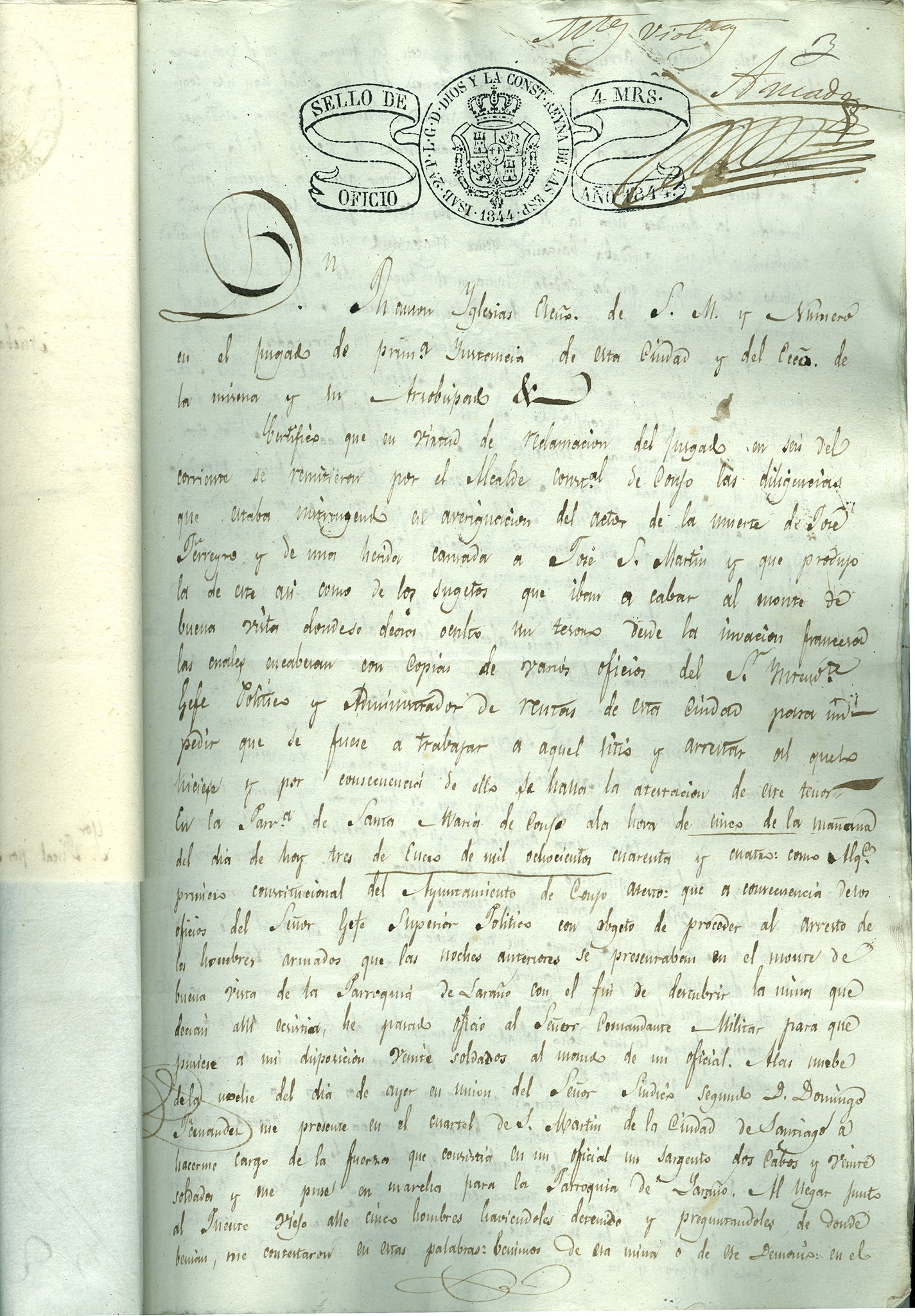 “En la parroquia de Santa María de Conjo, a las horas de cinco de la mañana del día de hoy, tres de enero de mil ochocientos cuarenta y cuatro, como Alcalde primero constitucional del Ayuntamiento del Conjo atesto: que a consecuencia de los oficios del señor Gefe Superior Político con obgeto de proceder al arresto de los hombres armados que las noches anteriores se presentaban en el monte de Buena Vista de la parroquia de Laraño con el fin de descubrir las minas que decían allí ecsistían, he pasado oficio al señor Comandante Militar para que pusiese a mi disposición veinte soldados al mando de un oficial. A las nuebe de la noche del día de ayer, en unión del señor Síndico segundo, don Domingo Fernández, me presenté en el cuartel de San Martín de la ciudad de Santiago a hacerme cargo de la fuerza, que consistía en un oficial, un sargento, dos cabos y veinte soldados, y me puse en marcha para la parroquia de Laraño. Al llegar junto al puente Viejo allé cinco hombres, haviéndoles detenido y preguntándoles de dónde benían, me contestaron en estas palabras: