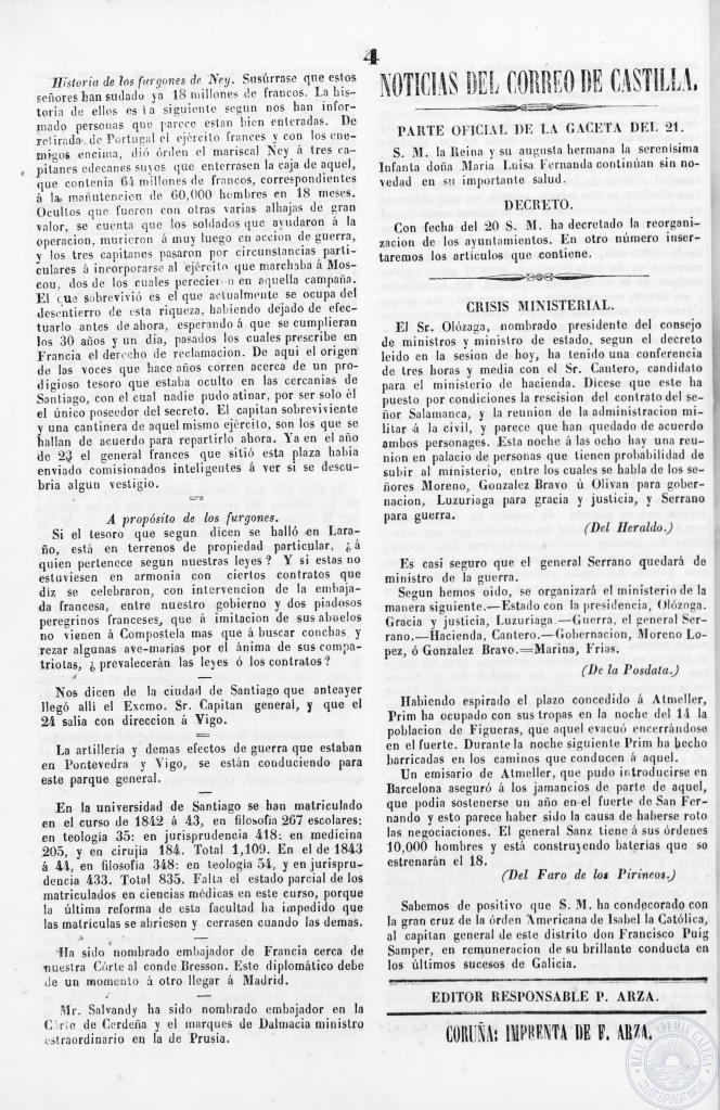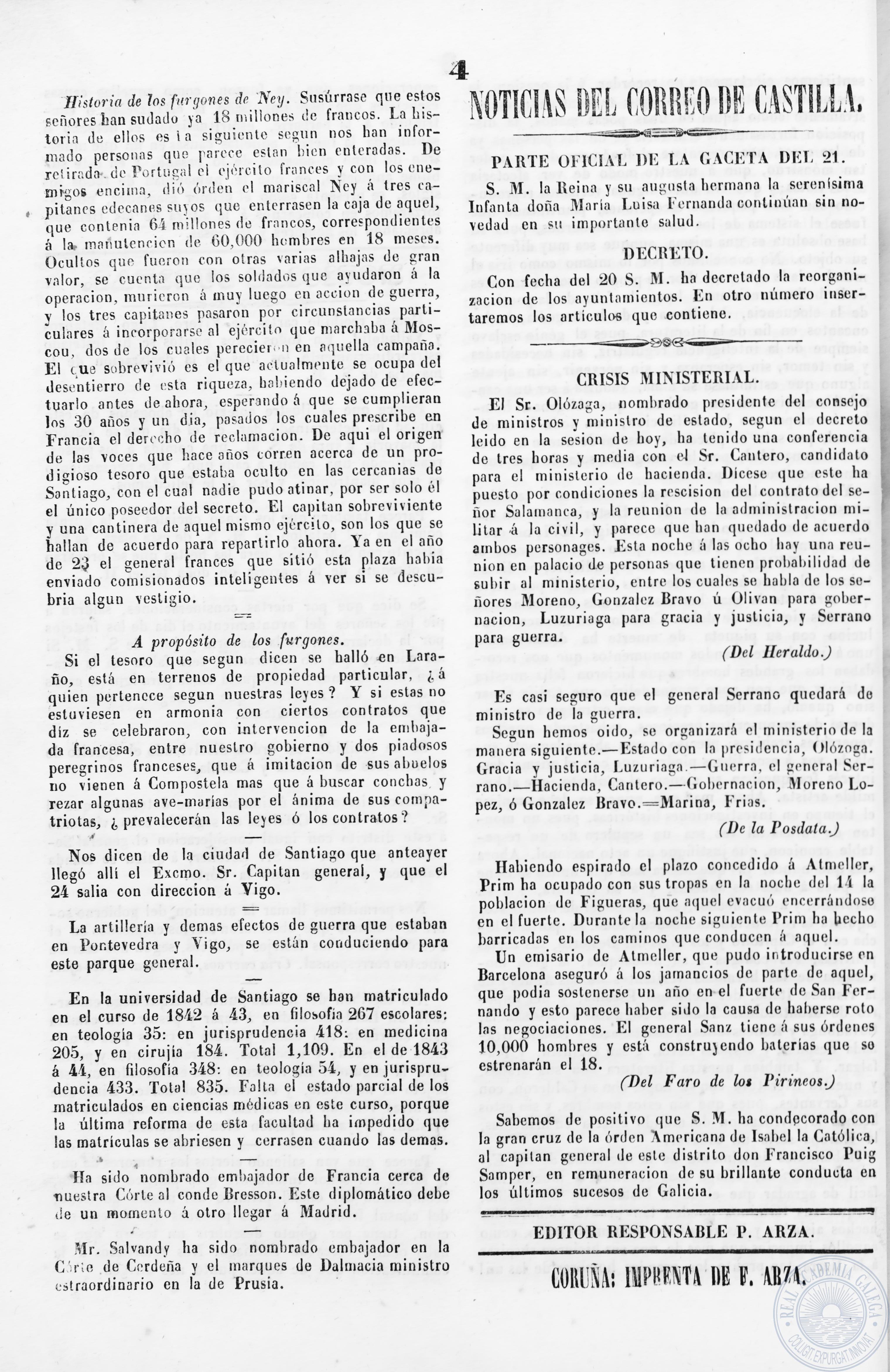 O 18 de novembro de 1843 a publicación El Centinela de Galicia recolle a seguinte información (páx. 4):