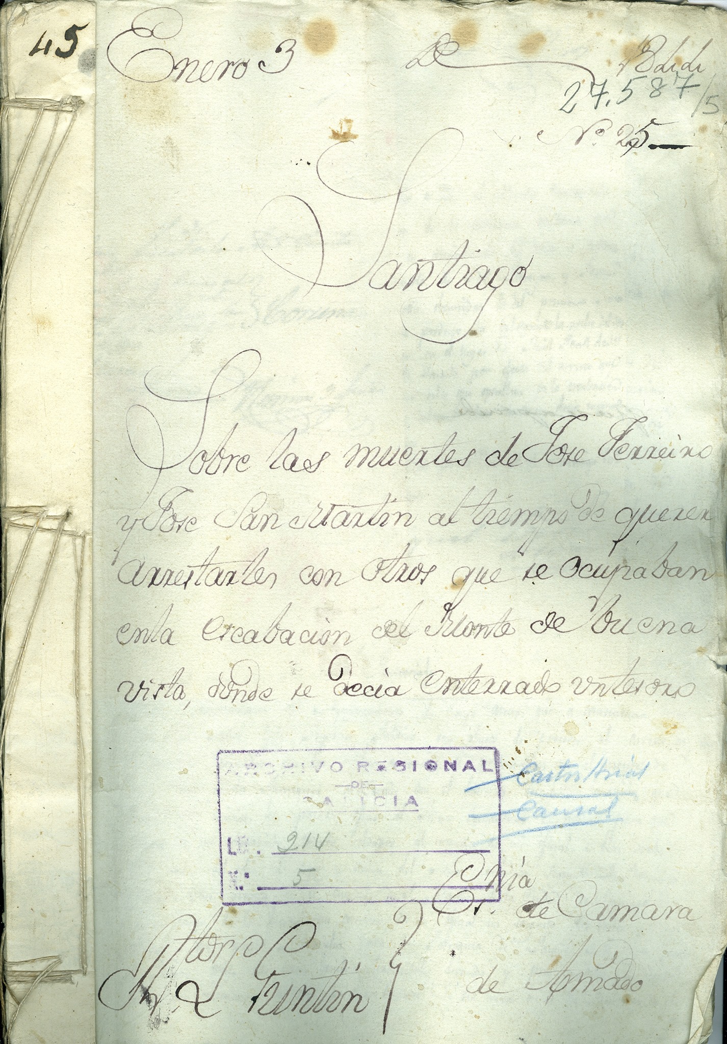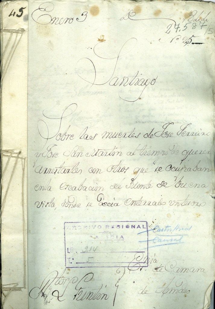 Arquivo do Reino de Galicia. Fondo documental da Audiencia Territorial da Coruña. Dilixencias sobre a morte de José Ferreiro e José San Martín cando ían ser arrestados pola escavación do monte de Boa Vista (Laraño, A Coruña), onde se dicía enterrado un tesouro. Signatura 27.587-5. 1844.