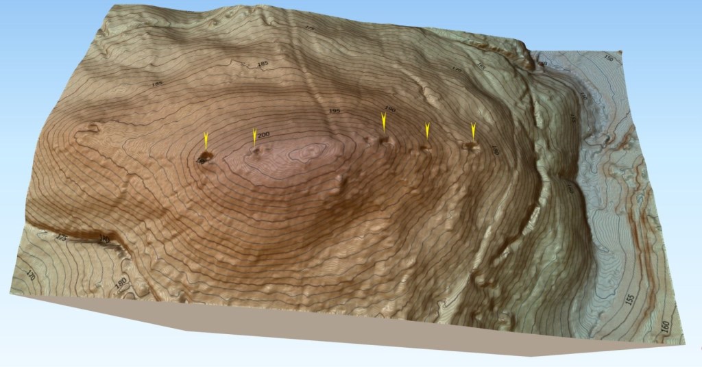 A esperanza e esforzos dos veciños de Laraño nos primeiros días de xaneiro de 1844 deixaron outras pegadas máis tanxibles. Unha visualización do visor lidar do monte amosa varios buratos no seu cumio aliñados no cambio de pendente. Son afondamentos no terreo de profundidades e formas variadas, nos que o noso compañeiro Ramiro cando era un rapazote cazaba víboras para levalas á Facultade de Universidade.