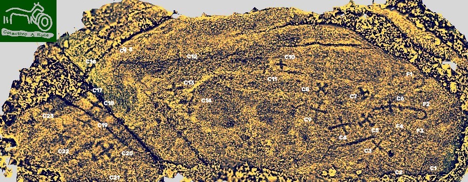 Contabilizamos 23 cruciformes de diferentes tipoloxías, catro ferraduras, unha coviña e algún suco indeterminado. Unha das ferraduras (F2) prolonga un dos seus brazos chegando a conectar cunha cruz grega potenzada (C6).