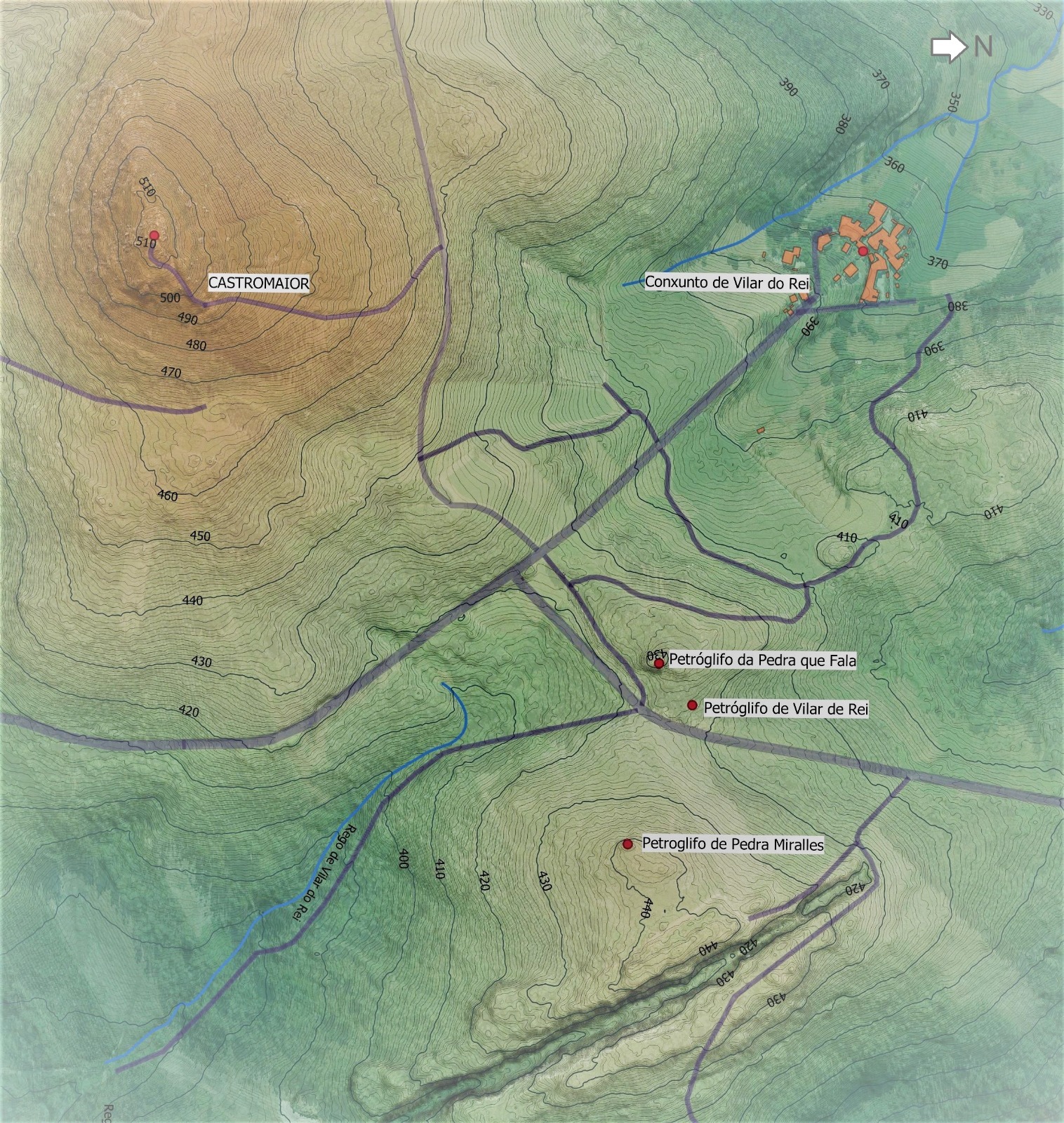 Estas dúas estacións rupestres teñen varias características en común. A máis evidente a súa localización en posicións dominantes sobre un cruce de camiños, elemento que vertebra as comunicacións deste territorio. Desde ambas, o control visual do cruce e a súa contorna é total, só limitado cara o oeste polo Castromaior.