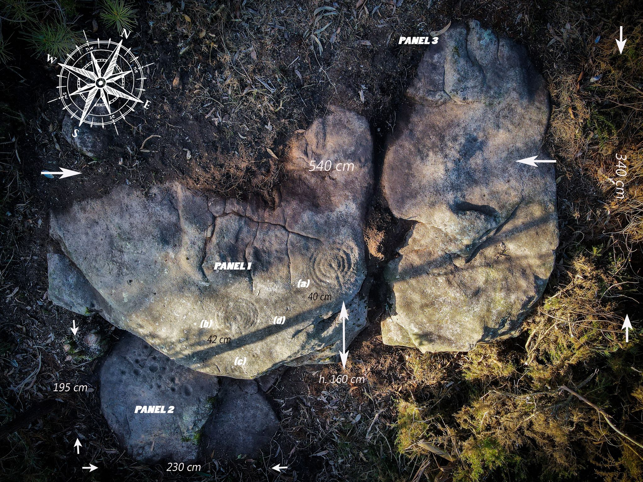 Na parte central e máis elevada da rocha figura o panel 1, o panel principal, con dúas combinacións de círculos concéntricos. A combinación (A) mellor conservada, de 40 cm de diámetro, presenta 5 aneis, os dous últimos incompletos, con dous sucos de saída que parten da coviña central, un cara o N e outro ó SE. A 60 cm ó SO hai unha segunda combinación (B) moito máis erosionada, de 42 cm, que conta con 6 aneis e dous sucos de saída, ambos finalizan nunha coviña (C), rodeada por un anel duns 8 cm, situados no bordo inferior da laxe, ó SE.
