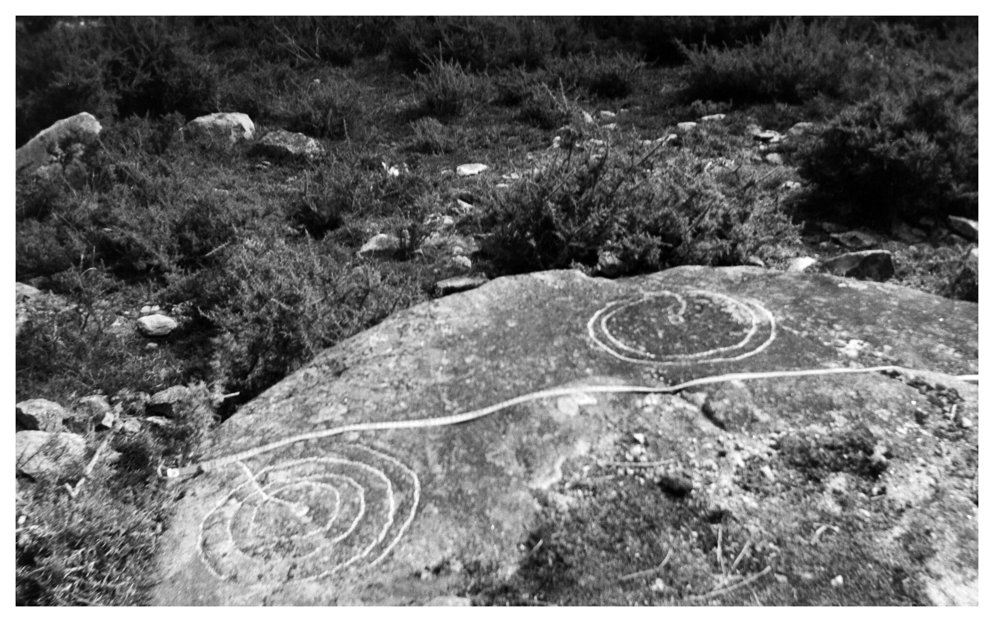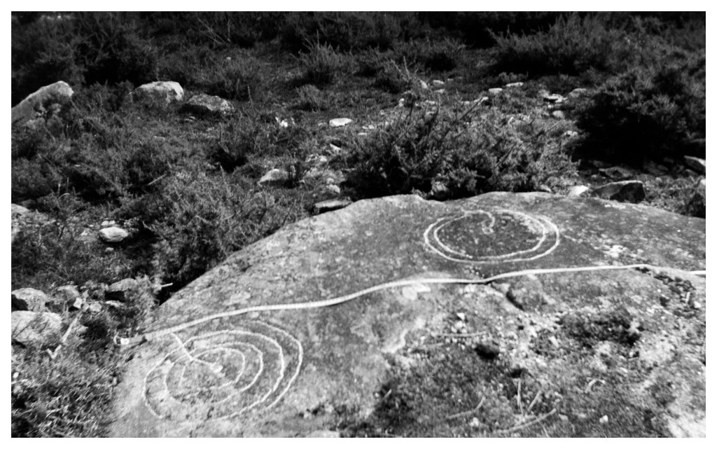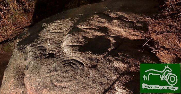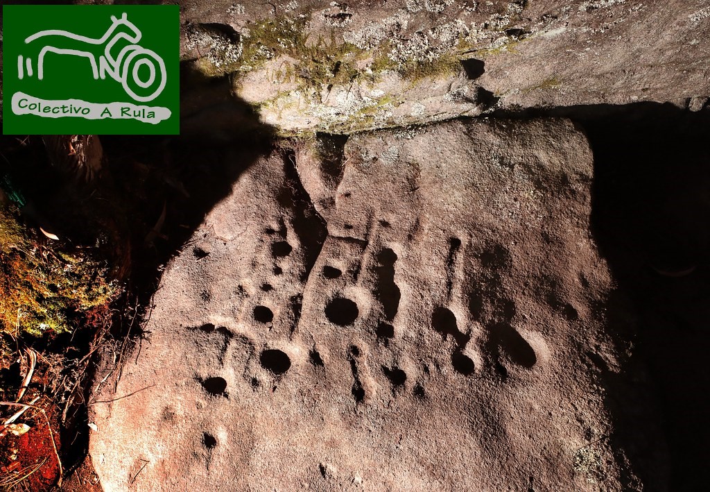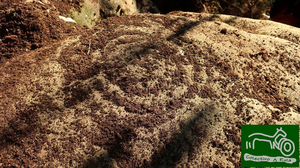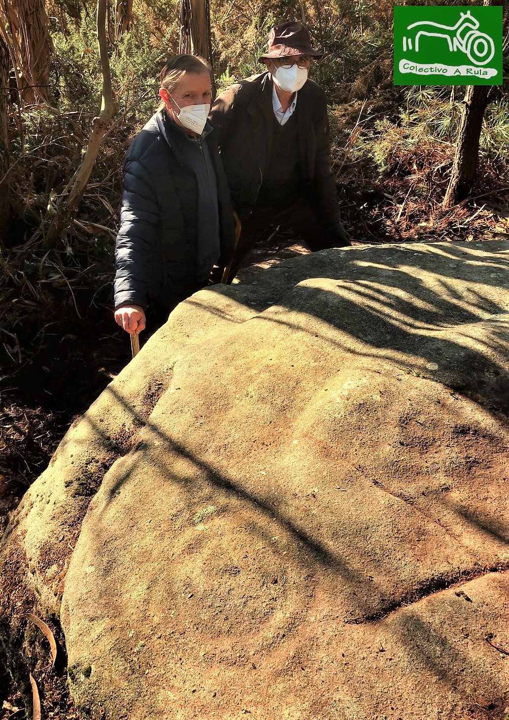 Non sen dificultade, logramos abrir un pequeno carreiro dende a estrada ata a peneda para, finalmente, volver observar os gravados que descubrira hai máis de oitenta anos Oscar Lojo Batalla – Sampedro, que posteriormente, no ano 1948, visitara e estudara o arqueólogo Ramón Sobrino Lorenzo – Ruza (1948) e que dende entón só vira de novo o noso guía.