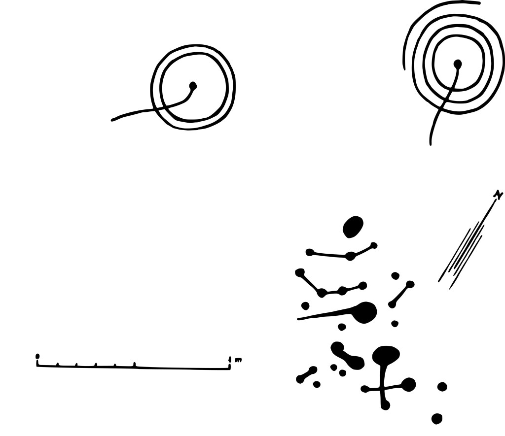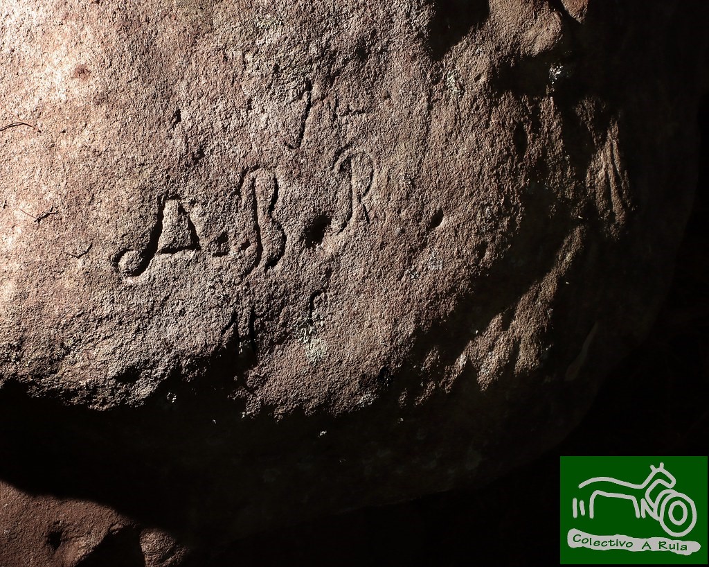 Na parte oeste do panel constan tres alfabetiformes separados con puntos, realizados a cicel, “A.B.R.”, imaxinamos que se trata das iniciais dalgún veciño que hai unhas cantas décadas quixo deixar a súa pegada ó carón das gravuras prehistóricas. Tamén observamos restos doutras posibles iniciais case imperceptibles por encima. Por debaixo distinguimos as letras 1 P S E.