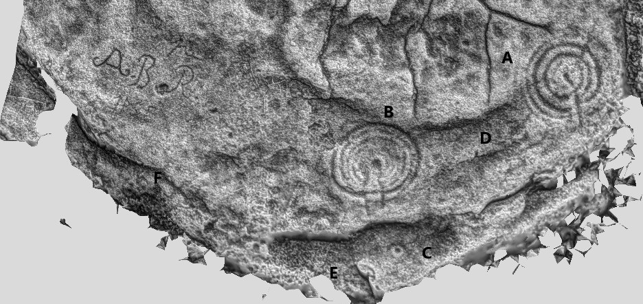 No mesmo borde inferior da superficie próxima ó motivo C consérvase un círculo con coviñas no seu interior (E), alterado por unha fisura da rocha. Un círculo con coviñas similar (F) tamén se localiza no bordo inferior da superficie, por debaixo dos alfabetiformes.