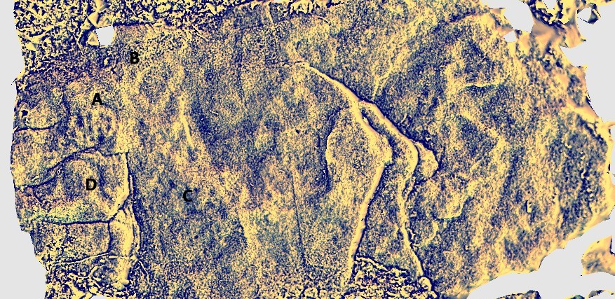 Finalmente, no canto superior do afloramento granítico, cara o N, consérvanse moi deteriorado un círculo con coviñas no seu interior (A) que se acomoda á forma dunha protuberancia da rocha, Ó seu carón dous círculos concéntricos de formas irregulares (B). Un suco semella conformar un círculo incompleto (D). Unha última combinación circular de cando menos dous círculos concéntricos consérvase moi deteriorada. Todos estes motivos son practicamente imperceptibles con luz diúrna. Próximos a estes motivos observamos uns rebaixes na superficie de posible orixe antrópica.