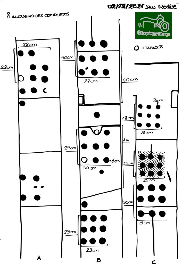 En dous casos das tres aliñacións de tres coviñas que conforma cada taboleiro atópanse en dous perpiaños diferentes, algo non habitual nesta tipoloxía de taboleiros.
