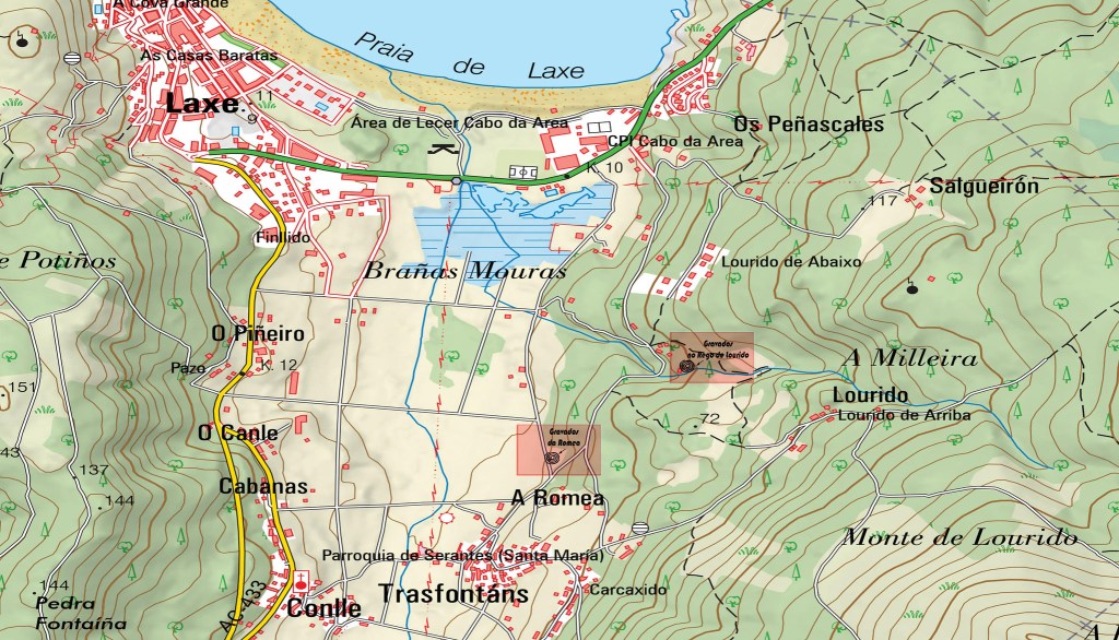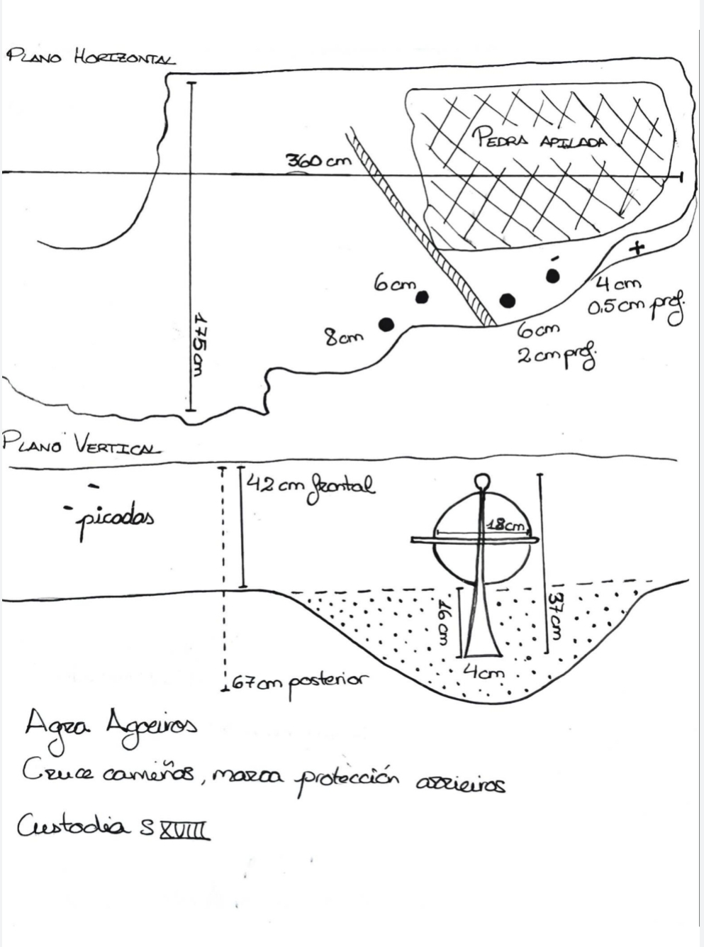 A continuación, achegámonos ata o sitio nomeado como a “Agra de Agoeiros” para visitar unha segunda estación de gravados rupestres situada á beira da estrada que dende o Cabo da Area en Laxe se dirixe ós lugares da Romea e Trasfontáns na parroquia de Serantes. Entre esta estrada e o antigo camiño, que quedou en desuso, localízase unha laxe situada sobre o propio noiro da estrada, con unhas dimensións de 360 cm de longo por 175 cm de ancho.