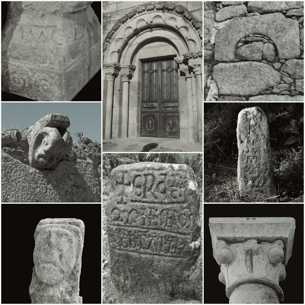 Na propio templo existen gravados semellantes como os aneis e combinacións circulares das basas decoradas do arco triunfal. Porén estes deseños presentan sucos moito máis finos e regulares. Non é descartable que os gravados prehistóricos da contorna do mosteiro foran fonte de inspiración ós mestres canteiros do románico.
